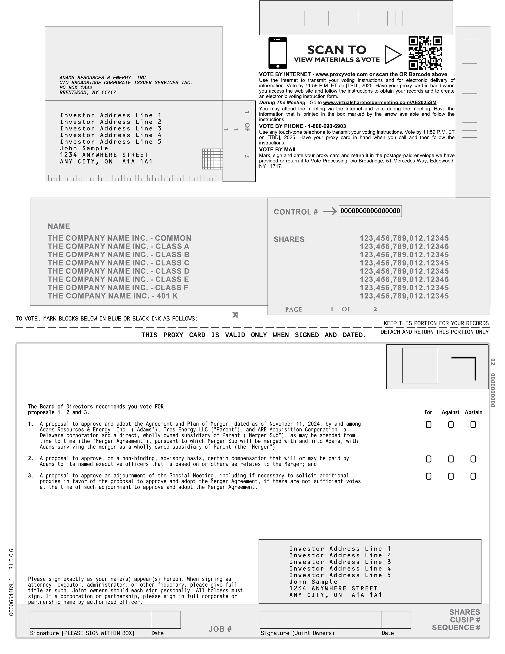 ADAMS RESOURCES & ENERGY, INC. C/O BROADRIDGE CORPORATE ISSUER SERVICES INC. PO BOX 1342 BRENTWOOD, NY 11717 Investor Address Line 1 Investor Address Line 2 Investor Address Line 3 Investor Address Line 4 Investor Address Line 5 John Sample 1234 ANYWHERE STREET ANY CITY, ON A1A 1A1 1 1 1 OF 2 SCAN TO VIEW MATERIALS & VOTE VOTE BY INTERNET - www.proxyvote.com or scan the QR Barcode above Use the Internet to transmit your voting instructions and for electronic delivery of information. Vote by 11:59 P.M. ET on [TBD], 2025. Have your proxy card in hand when you access the web site and follow the instructions to obtain your records and to create an electronic voting instruction form. During The Meeting - Go to www.virtualshareholdermeeting.com/AE2025SM You may attend the meeting via the Internet and vote during the meeting. Have the information that is printed in the box marked by the arrow available and follow the instructions. VOTE BY PHONE - 1-800-690-6903 Use any touch-tone telephone to transmit your voting instructions. Vote by 11:59 P.M. ET on [TBD], 2025. Have your proxy card in hand when you call and then follow the instructions. VOTE BY MAIL Mark, sign and date your proxy card and return it in the postage-paid envelope we have provided or return it to Vote Processing, c/o Broadridge, 51 Mercedes Way, Edgewood, NY 11717. NAME THE COMPANY NAME INC. - COMMON THE COMPANY NAME INC. - CLASS A THE COMPANY NAME INC. - CLASS B THE COMPANY NAME INC. - CLASS C THE COMPANY NAME INC. - CLASS D THE COMPANY NAME INC. - CLASS E THE COMPANY NAME INC. - CLASS F THE COMPANY NAME INC. - 401 K 123,456,789,012.12345 123,456,789,012.12345 123,456,789,012.12345 123,456,789,012.12345 123,456,789,012.12345 123,456,789,012.12345 123,456,789,012.12345 123,456,789,012.12345 → 1 OF 2 PAGE CONTROL # SHARES TO VOTE, MARK BLOCKS BELOW IN BLUE OR BLACK INK AS FOLLOWS: KEEP THIS PORTION FOR YOUR RECORDS DETACH AND RETURN THIS PORTION ONLY THIS PROXY CARD IS VALID ONLY WHEN SIGNED AND DATED. The Board of Directors recommends you vote FOR proposals 1, 2 and 3. For Against Abstain 1. A proposal to approve and adopt the Agreement and Plan of Merger, dated as of November 11, 2024, by and among Adams Resources & Energy, Inc. (“Adams”), Tres Energy LLC (“Parent”), and ARE Acquisition Corporation, a Delaware corporation and a direct, wholly owned subsidiary of Parent (“Merger Sub”), as may be amended from time to time (the “Merger Agreement”), pursuant to which Merger Sub will be merged with and into Adams, with Adams surviving the merger as a wholly owned subsidiary of Parent (the “Merger”); 2. A proposal to approve, on a non-binding, advisory basis, certain compensation that will or may be paid by Adams to its named executive officers that is based on or otherwise relates to the Merger; and 3. A proposal to approve an adjournment of the Special Meeting, including if necessary to solicit additional proxies in favor of the proposal to approve and adopt the Merger Agreement, if there are not sufficient votes at the time of such adjournment to approve and adopt the Merger Agreement. Investor Address Line 1 Investor Address Line 2 Investor Address Line 3 Investor Address Line 4 Investor Address Line 5 John Sample 1234 ANYWHERE STREET ANY CITY, ON A1A 1A1 Please sign exactly as your name(s) appear(s) hereon. When signing as attorney, executor, administrator, or other fiduciary, please give full title as such. Joint owners should each sign personally. All holders must sign. If a corporation or partnership, please sign in full corporate or partnership name by authorized officer. Signature [PLEASE SIGN WITHIN BOX] Date For Against Abstain JOB # Signature (Joint Owners) Date SHARES CUSIP # SEQUENCE # 0000654489_1 R1.0.0.6