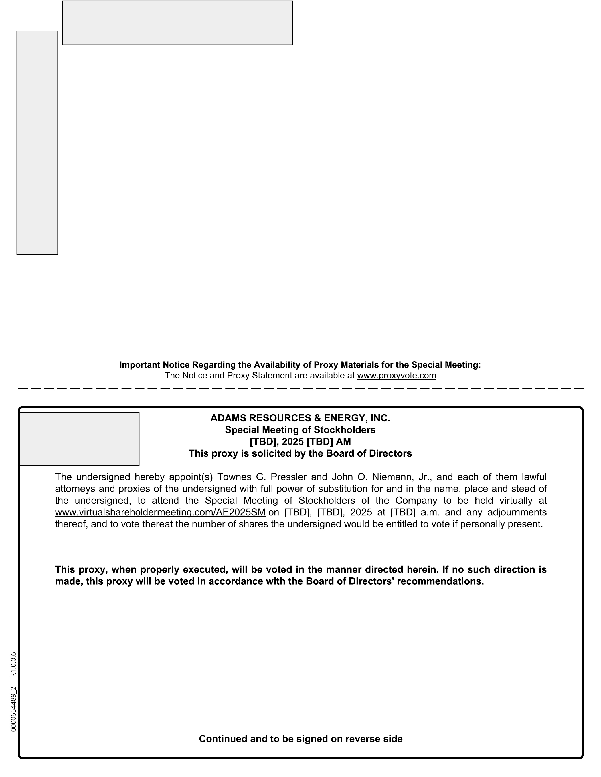 Important Notice Regarding the Availability of Proxy Materials for the Special Meeting: The Notice and Proxy Statement are available at www.proxyvote.com ADAMS RESOURCES & ENERGY, INC. Special Meeting of Stockholders [TBD], 2025 [TBD] AM This proxy is solicited by the Board of Directors The undersigned hereby appoint(s) Townes G. Pressler and John O. Niemann, Jr., and each of them lawful attorneys and proxies of the undersigned with full power of substitution for and in the name, place and stead of the undersigned, to attend the Special Meeting of Stockholders of the Company to be held virtually at www.virtualshareholdermeeting.com/AE2025SM on [TBD], [TBD], 2025 at [TBD] a.m. and any adjournments thereof, and to vote thereat the number of shares the undersigned would be entitled to vote if personally present. This proxy, when properly executed, will be voted in the manner directed herein. If no such direction is made, this proxy will be voted in accordance with the Board of Directors’ recommendations. Continued and to be signed on reverse side 0000654489_2 R1.0.0.6