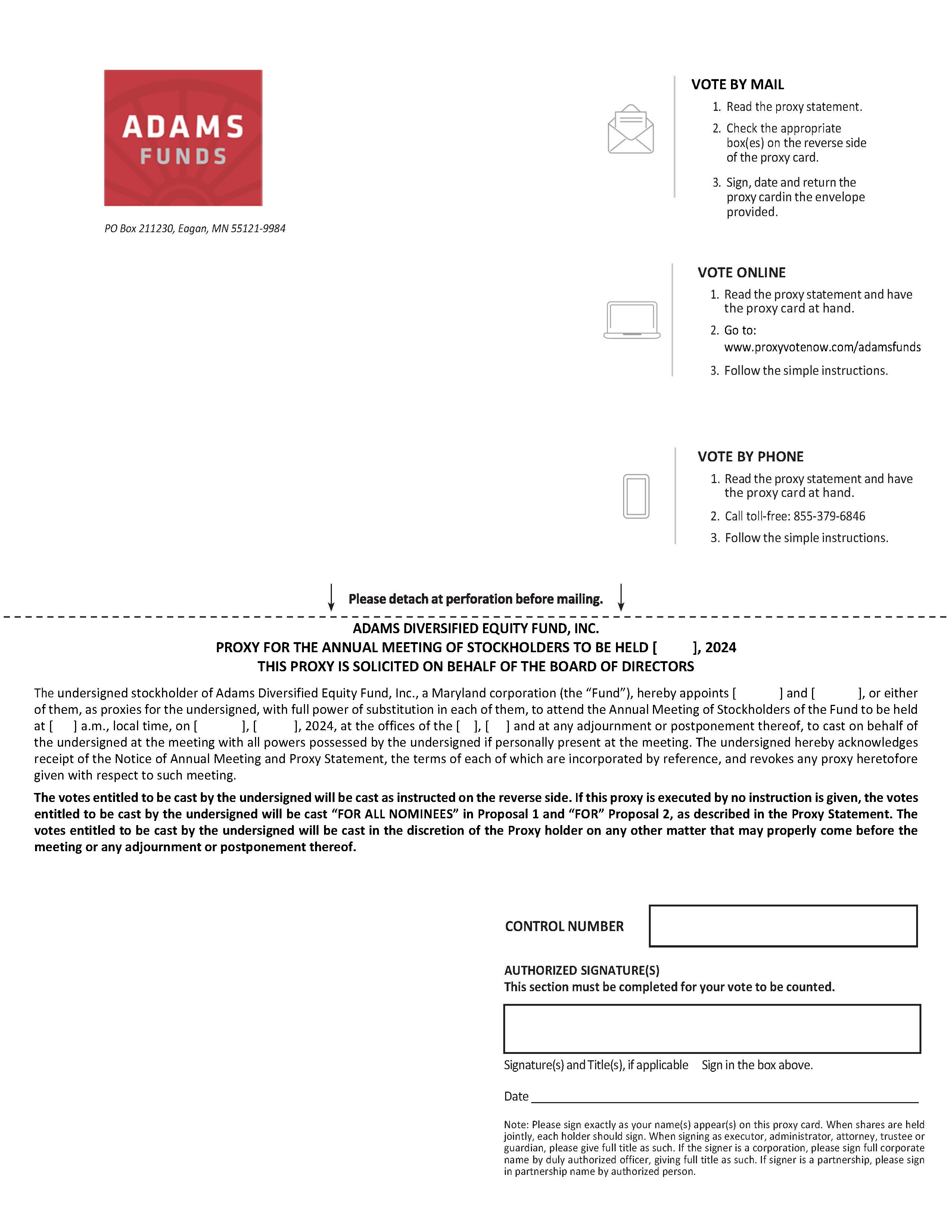 The Annual Meeting of Stockholders of Adams Diversified Equity Fund, Inc., a Maryland corporation (the “Fund”), will be held
