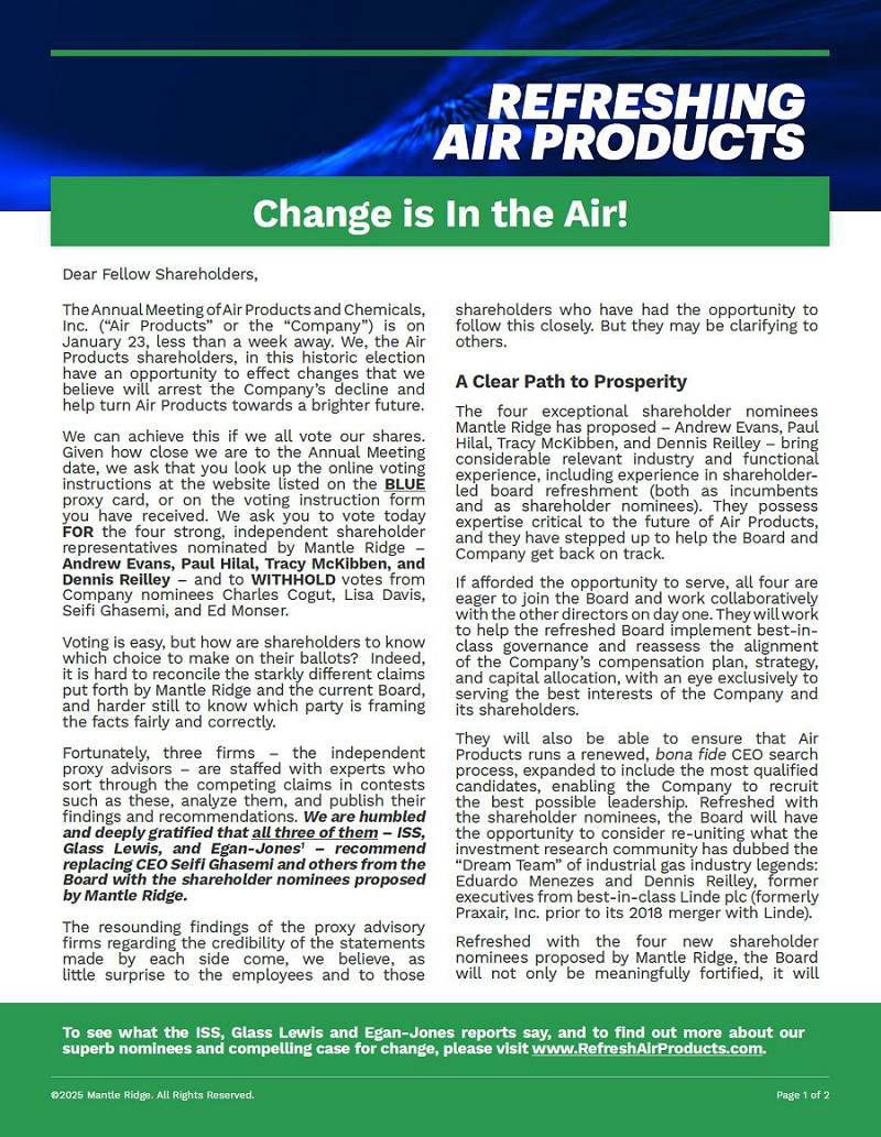NEW YORK – January 16, 2025 – Mantle Ridge LP, which, together with its affiliates (collectively, “Mantle Ridge”), beneficially owns approximately $1.3 billion of the outstanding common shares of Air Products and Chemicals, Inc. (NYSE: APD) (“Air Products” or the “Company”), today sent an open letter to Air Products shareholders regarding its four nominees up for election at the Company’s upcoming Annual Meeting on January 23, 2025.