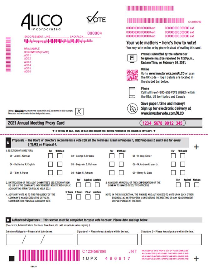 ALICO incorporated VOTE ENDORSEMENT LINE SACKPACK MR A SAMPLE DESIGNATION (IF ANY) ADD 1 ADD 2 ADD 3 ADD 4 ADD 5 ADD 6 C123456789 000000000.000000 ext 000000000.000000 ext 000000000.000000 ext 000000000.000000 ext 000000000.000000 ext 000000000.000000 ext Your vote matters – here’s how to vote! You may vote online or by phone instead of mailing this card. Proxies submitted by the Internet or telephone must be received by 11:59 p.m., Eastern Time, on February 24, 2021. Online Go to www.investorvote.com/ALCO or scan the QR code — login details are located in the shaded bar below. Phone Call toll free 1-800-652-VOTE (8683) within the USA, US territories and Canada Save paper, time and money! Sign up for electronic delivery at www.investorvote.com/ALCO Using a black ink pen, mark your votes with an X as shown in this example. Please do not write outside the designated areas. 2021 Annual Meeting Proxy Card 1234 5678 9012 345 IF VOTING BY MAIL, SIGN, DETACH AND RETURN THE BOTTOM PORTION IN THE ENCLOSED ENVELOPE A Proposals — The Board of Directors recommends a vote FOR all the nominees listed in Proposal 1, FOR Proposals 2 and 3 and for every A 3 YEARS on Proposal 4. 1. ELECTION OF DIRECTORS: For Withhold 01 - John E. Kiernan 02 - George R. Brokaw 03 - R. Greg Eisner For Withhold 04 - Katherine R. English 05 - Benjamin D. Fishman 06 - W. Andrew Krusen Jr. For Withhold 07 - Toby K. Purse 08 - Adam H. Putnam 09 - Henry R. Slack 2. RATIFICATION OF THE AUDIT COMMITTEE’S SELECTION OF RSM US LLP AS THE COMPANY’S INDEPENDENT REGISTERED PUBLIC ACCOUNTING FIRM FOR FISCAL YEAR 2021 For Against Abstain 3. ADVISORY APPROVAL OF THE COMPENSATION OF THE COMPANY’S NAMED EXECUTIVE OFFICERS For Against Abstain 4. ADVISORY VOTE AS TO THE FREQUENCY OF THE COMPANY’S NAMED EXECUTIVE OFFICERS COMPENSATION PROGRAM ADVISORY VOTE 3 Years 2 Years 1 Year Abstain NOTE: IN THEIR DISCRETION, THE PROXIES ARE AUTHORIZED TO VOTE UPON SUCH OTHER BUSINESS AS MAY PROPERLY COME BEFORE THE MEETING OR ANY ADJOURNMENT OR POSTPONEMENT THEREOF. B Authorized Signatures — This section must be completed for your vote to count. Please date and sign below. (Executors, Administrators, Trustees, Guardians, etc. will so indicate when signing.) Date (mm/dd/yyyy) — Please print date below. Signature 1 — Please keep signature within the box. Signature 2 — Please keep signature within the box. C 1234567890 JNT 1 U P X 4 8 6 9 1 7 MR A SAMPLE (THIS AREA IS SET UP TO ACCOMMODATE 140 CHARACTERS) MR A SAMPLE AND MR A SAMPLE AND MR A SAMPLE AND MR A SAMPLE AND MR A SAMPLE AND MR A SAMPLE AND MR A SAMPLE AND MR A SAMPLE AND 03D5JD