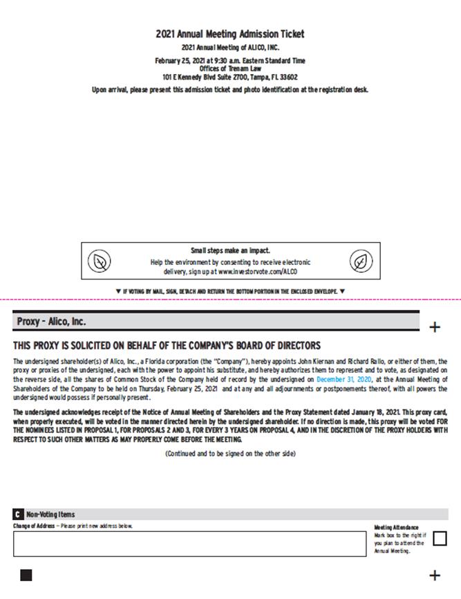 2021 Annual Meeting Admission Ticket 2021 Annual Meeting of ALICO, INC. February 25, 2021 at 9:30 a.m. Eastern Standard Time Offices of Trenam Law 101 E Kennedy Blvd Suite 2700, Tampa, FL 33602 Upon arrival, please present this admission ticket and photo identification at the registration desk. Small steps make an impact. Help the environment by consenting to receive electronic delivery, sign up at www.investorvote.com/ALCO IF VOTING BY MAIL, SIGN, DETACH AND RETURN THE BOTTOM PORTION IN THE ENCLOSED ENVELOPE. Proxy - Alico, Inc. THIS PROXY IS SOLICITED ON BEHALF OF THE COMPANY’S BOARD OF DIRECTORS The undersigned shareholder(s) of Alico, Inc., a Florida corporation (the “Company”), hereby appoints John Kiernan and Richard Rallo, or either of them, the proxy or proxies of the undersigned, each with the power to appoint his substitute, and hereby authorizes them to represent and to vote, as designated on the reverse side, all the shares of Common Stock of the Company held of record by the undersigned on December 31, 2020, at the Annual Meeting of Shareholders of the Company to be held on Thursday, February 25, 2021 and at any and all adjournments or postponements thereof, with all powers the undersigned would possess if personally present. The undersigned acknowledges receipt of the Notice of Annual Meeting of Shareholders and the Proxy Statement dated January 18, 2021. This proxy card, when properly executed, will be voted in the manner directed herein by the undersigned shareholder. If no direction is made, this proxy will be voted FOR THE NOMINEES LISTED IN PROPOSAL 1, FOR PROPOSALS 2 AND 3, FOR EVERY 3 YEARS ON PROPOSAL 4, AND IN THE DISCRETION OF THE PROXY HOLDERS WITH RESPECT TO SUCH OTHER MATTERS AS MAY PROPERLY COME BEFORE THE MEETING. (Continued and to be signed on the other side) C Non-Voting Items Change of Address — Please print new address below. Meeting Attendance Mark box to the right if you plan to attend the Annual Meeting.
