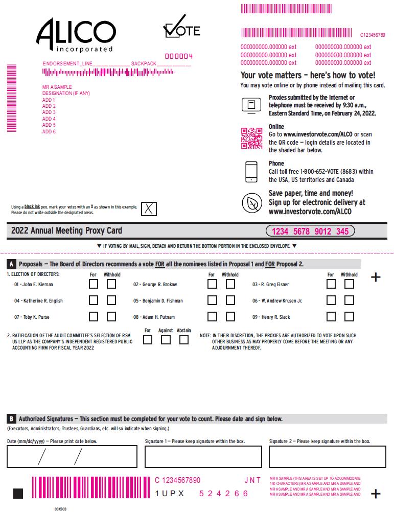 2022 Annual Meeting Admission Ticket 2022Annual Meeting ofALICO, INC. February 24,2022at9:30a.m. Eastern StandardTime Offices ofTrenam Law 101 EKennedy BlvdSuite2700, Tampa, FL33602 Uponarrival, pleasepresentthisadmission ticketand photo identificationat the registrationdesk. Small steps make an impact. Help the environment by consenting to receive electronic delivery, sign up at www.investorvote.com/ALCO • IF VOTING BY MAIL, SIGN, DETACH AND RETURN THEBOTTOM PORTION IN THEENCLOSED ENVELOPE. • Proxy -Alico, Inc. + THIS PROXY IS SOLICITED ON BEHALF OF THE COMPANY’S BOARD OF DIRECTORS Theundersignedshareholder(s)ofAlico, Inc., aFloridacorporation(the “Company”),herebyappointsJohnKiernanandRichardRallo, oreitherofthem,the proxy or proxies of the undersigned, each with the power to appoint his substitute, and hereby authorizes them to represent and to vote, as designated on the reverse side, all the shares of Common Stock of the Company held of record by the undersigned on December 31, 2021, at the Annual Meeting of Shareholders of the Company to be held on Thursday, February 24, 2022 and at any and all adjournments or postponements thereof, with all powers the undersigned would possess if personally present. The undersigned acknowledges receipt of the Notice of Annual Meeting of Shareholders and the Proxy Statement dated January 17, 2022. This proxy card, when properly executed, will be voted in the manner directed herein by the undersigned shareholder. If no direction is made, this proxy will be voted FOR THENOMINEESLISTEDINPROPOSAL1ANDFORPROPOSAL2,ANDINTHEDISCRETIONOFTHEPROXYHOLDERSWITHRESPECTTOSUCHOTHERMATTERSASMAY PROPERLY COMEBEFORE THEMEETING. (Continued and to be signed on the other side) Non-Voting Items C Change of Address — Please print new address below. Meeting Attendance Mark box to the right if you plan to attend the Annual Meeting. +