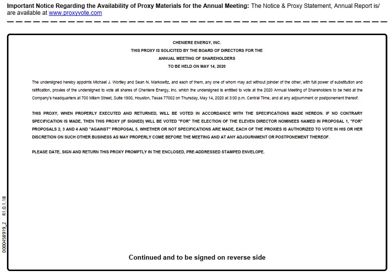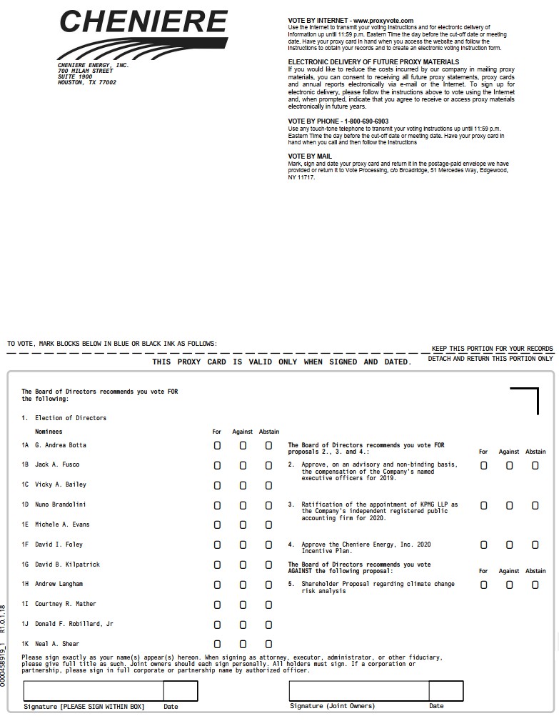 THIS PROXY CARD IS VALID ONLY WHEN SIGNED AND DATED. KEEP THIS PORTION FOR YOUR RECORDS DETACH AND RETURN THIS PORTION ONLY TO VOTE, MARK BLOCKS BELOW IN BLUE OR BLACK INK AS FOLLOWS: Signature [PLEASE SIGN WITHIN BOX] Date Signature (Joint Owners) Date 0 0 0 0 0 0 0 0 0 0 0 0 0 0 0 0 0 0 0 0 0 0 0 0 0 0 0 0 0 0 0 0 0 0 0 0 0 0 0 0 0 0 0 0 0 0000458919_1 R1.0.1.18 CHENIERE ENERGY, INC. 700 MILAM STREET SUITE 1900 HOUSTON, TX 77002 VOTE BY INTERNET - www.proxyvote.com Use the Internet to transmit your voting instructions and for electronic delivery of information up until 11:59 p.m. Eastern Time the day before the cut-off date or meeting date. Have your proxy card in hand when you access the website and follow the instructions to obtain your records and to create an electronic voting instruction form. ELECTRONIC DELIVERY OF FUTURE PROXY MATERIALS If you would like to reduce the costs incurred by our company in mailing proxy materials, you can consent to receiving all future proxy statements, proxy cards and annual reports electronically via e-mail or the Internet. To sign up for electronic delivery, please follow the instructions above to vote using the Internet and, when prompted, indicate that you agree to receive or access proxy materials electronically in future years. VOTE BY PHONE - 1-800-690-6903 Use any touch-tone telephone to transmit your voting instructions up until 11:59 p.m. Eastern Time the day before the cut-off date or meeting date. Have your proxy card in hand when you call and then follow the instructions VOTE BY MAIL Mark, sign and date your proxy card and return it in the postage-paid envelope we have provided or return it to Vote Processing, c/o Broadridge, 51 Mercedes Way, Edgewood, NY 11717. The Board of Directors recommends you vote FOR the following: 1. Election of Directors Nominees For Against Abstain 1A G. Andrea Botta 1B Jack A. Fusco 1C Vicky A. Bailey 1D Nuno Brandolini 1E Michele A. Evans 1F David I. Foley 1G David B. Kilpatrick 1H Andrew Langham 1I Courtney R. Mather 1J Donald F. Robillard, Jr 1K Neal A. Shear The Board of Directors recommends you vote FOR proposals 2., 3. and 4.: For Against Abstain 2. Approve, on an advisory and non-binding basis, the compensation of the Company's named executive officers for 2019. 3. Ratification of the appointment of KPMG LLP as the Company's independent registered public accounting firm for 2020. 4. Approve the Cheniere Energy, Inc. 2020 Incentive Plan. The Board of Directors recommends you vote AGAINST the following proposal: For Against Abstain 5. Shareholder Proposal regarding climate change risk analysis Please sign exactly as your name(s) appear(s) hereon. When signing as attorney, executor, administrator, or other fiduciary, please give full title as such. Joint owners should each sign personally. All holders must sign. If a corporation or partnership, please sign in full corporate or partnership name by authorized officer.0000458919_2 R1.0.1.18
