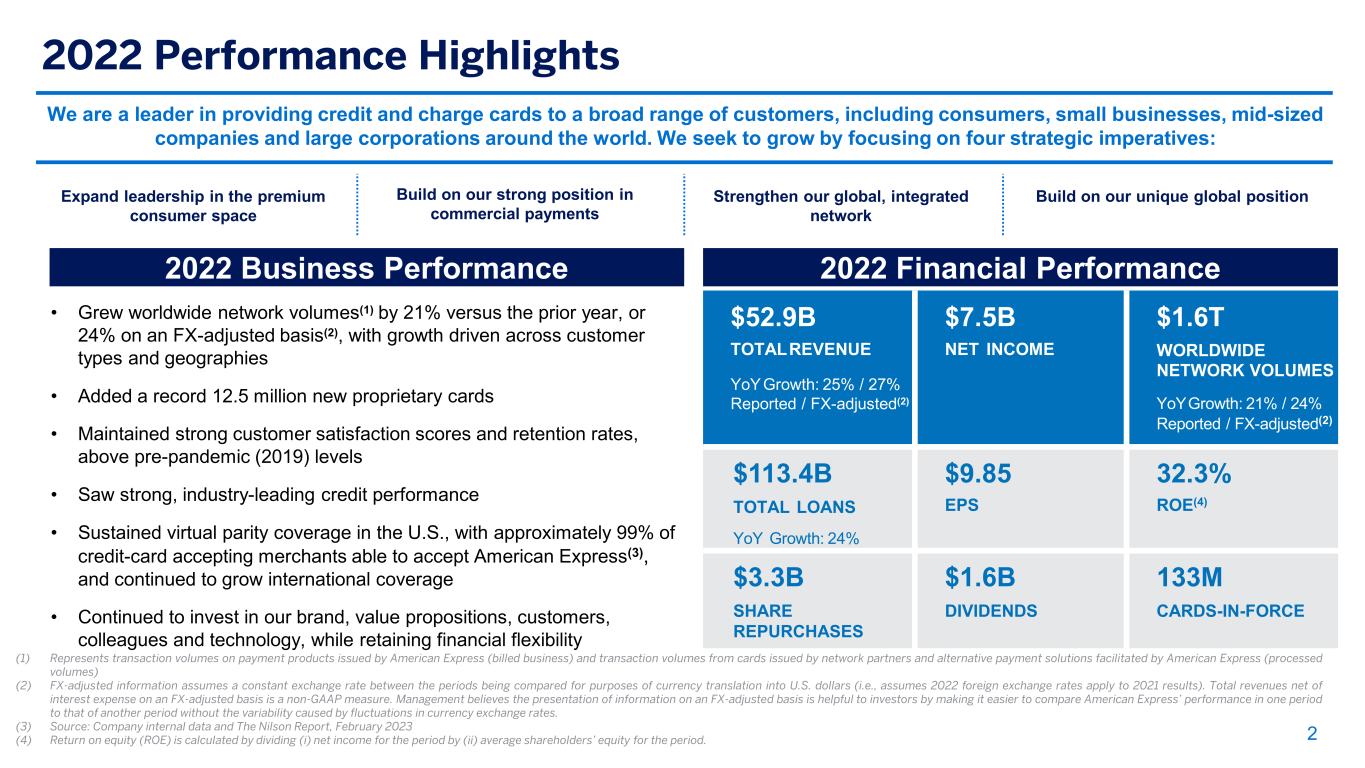 (1) Represents transaction volumes on payment products issued by American Express (billed business) and transaction volumes from cards issued by network partners and alternative payment solutions facilitated by American Express (processed volumes) (2) FX-adjusted information assumes a constant exchange rate between the periods being compared for purposes of currency translation into U.S. dollars (i.e., assumes 2022 foreign exchange rates apply to 2021 results). Total revenues net of interest expense on an FX-adjusted basis is a non-GAAP measure. Management believes the presentation of information on an FX-adjusted basis is helpful to investors by making it easier to compare American Express’ performance in one period to that of another period without the variability caused by fluctuations in currency exchange rates. (3) Source: Company internal data and The Nilson Report, February 2023 (4) Return on equity (ROE) is calculated by dividing (i) net income for the period by (ii) average shareholders’ equity for the period. 2022 Performance Highlights 2022 Business Performance 2022 Financial Performance • Grew worldwide network volumes(1) by 21% versus the prior year, or 24% on an FX-adjusted basis(2), with growth driven across customer types and geographies • Added a record 12.5 million new proprietary cards • Maintained strong customer satisfaction scores and retention rates, above pre-pandemic (2019) levels • Saw strong, industry-leading credit performance • Sustained virtual parity coverage in the U.S., with approximately 99% of credit-card accepting merchants able to accept American Express(3), and continued to grow international coverage • Continued to invest in our brand, value propositions, customers, colleagues and technology, while retaining financial flexibility $52.9B TOTALREVENUE YoYGrowth: 25% / 27% Reported / FX-adjusted(2) $7.5B NET INCOME $1.6T WORLDWIDE NETWORK VOLUMES YoYGrowth: 21% / 24% Reported / FX-adjusted(2) $113.4B TOTAL LOANS YoY Growth: 24% $9.85 EPS 32.3% ROE(4) $3.3B SHARE REPURCHASES $1.6B DIVIDENDS 133M CARDS-IN-FORCE We are a leader in providing credit and charge cards to a broad range of customers, including consumers, small businesses, mid-sized companies and large corporations around the world. We seek to grow by focusing on four strategic imperatives: Expand leadership in the premium consumer space Build on our strong position in commercial payments Strengthen our global, integrated network Build on our unique global position 2
