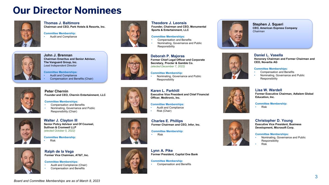 Our Director Nominees 3 Walter J. Clayton III Senior Policy Advisor and Of Counsel, Sullivan & Cromwell LLP (elected October 5, 2022) Committee Membership: • Risk Peter Chernin Founder and CEO, Chernin Entertainment, LLC Committee Memberships: • Compensation and Benefits • Nominating, Governance and Public Responsibility (Chair) Thomas J. Baltimore Chairman and CEO, Park Hotels & Resorts, Inc. Committee Membership: • Audit and Compliance Stephen J. Squeri CEO, American Express Company Chairman Christopher D. Young Executive Vice President, Business Development, Microsoft Corp. Committee Memberships: • Nominating, Governance and Public Responsibility • Risk Daniel L. Vasella Honorary Chairman and Former Chairman and CEO, Novartis AG Committee Memberships: • Compensation and Benefits • Nominating, Governance and Public Responsibility Theodore J. Leonsis Founder, Chairman and CEO, Monumental Sports & Entertainment, LLC Committee Memberships: • Compensation and Benefits • Nominating, Governance and Public Responsibility Karen L. Parkhill Executive Vice President and Chief Financial Officer, Medtronic, Inc. Committee Memberships: • Audit and Compliance • Risk (Chair) Lynn A. Pike Former President, Capital One Bank Committee Membership: • Compensation and Benefits Charles E. Phillips Former Chairman and CEO, Infor, Inc. Committee Membership: • Risk Lisa W. Wardell Former Executive Chairman, Adtalem Global Education, Inc. Committee Membership: • Risk Board and Committee Memberships are as of March 8, 2023 John J. Brennan Chairman Emeritus and Senior Advisor, The Vanguard Group, Inc. Lead Independent Director Committee Memberships: • Audit and Compliance • Compensation and Benefits (Chair) Ralph de la Vega Former Vice Chairman, AT&T, Inc. Committee Memberships: • Audit and Compliance (Chair) • Compensation and Benefits Deborah P. Majoras Former Chief Legal Officer and Corporate Secretary, Procter & Gamble Co. (elected December 7, 2022) Committee Membership: • Nominating, Governance and Public Responsibility