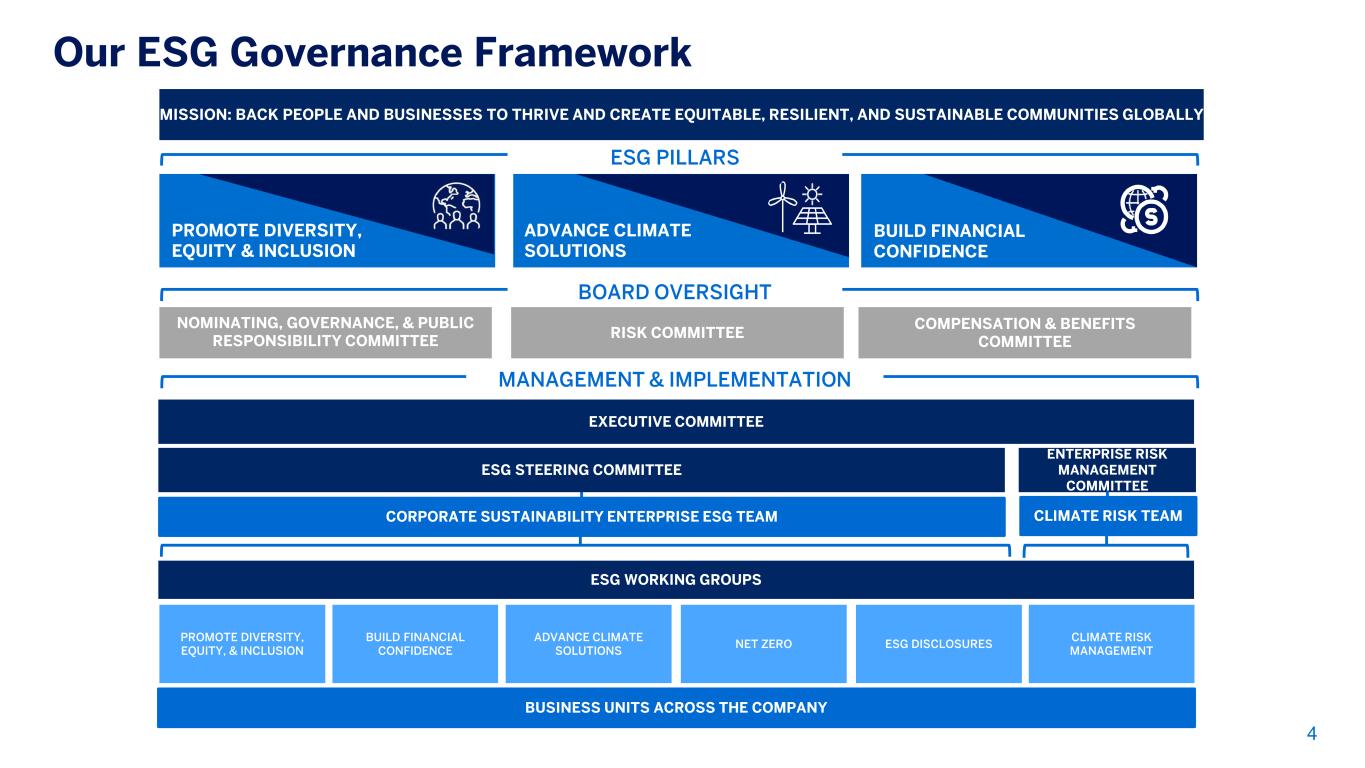 ESG WORKING GROUPS EXECUTIVE COMMITTEE ESG STEERING COMMITTEE NOMINATING, GOVERNANCE, & PUBLIC RESPONSIBILITY COMMITTEE COMPENSATION & BENEFITS COMMITTEERISK COMMITTEE PROMOTE DIVERSITY, EQUITY, & INCLUSION ENTERPRISE RISK MANAGEMENT COMMITTEE MISSION: BACK PEOPLE AND BUSINESSES TO THRIVE AND CREATE EQUITABLE, RESILIENT, AND SUSTAINABLE COMMUNITIES GLOBALLY BOARD OVERSIGHT PROMOTE DIVERSITY, EQUITY & INCLUSION CORPORATE SUSTAINABILITY ENTERPRISE ESG TEAM ADVANCE CLIMATE SOLUTIONS BUILD FINANCIAL CONFIDENCE ESG PILLARS CLIMATE RISK TEAM BUILD FINANCIAL CONFIDENCE ADVANCE CLIMATE SOLUTIONS NET ZERO ESG DISCLOSURES CLIMATE RISK MANAGEMENT BUSINESS UNITS ACROSS THE COMPANY MANAGEMENT & IMPLEMENTATION Our ESG Governance Framework 4
