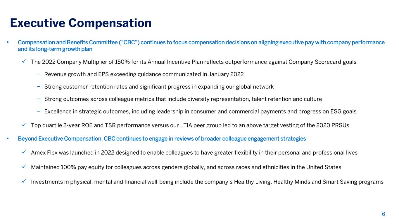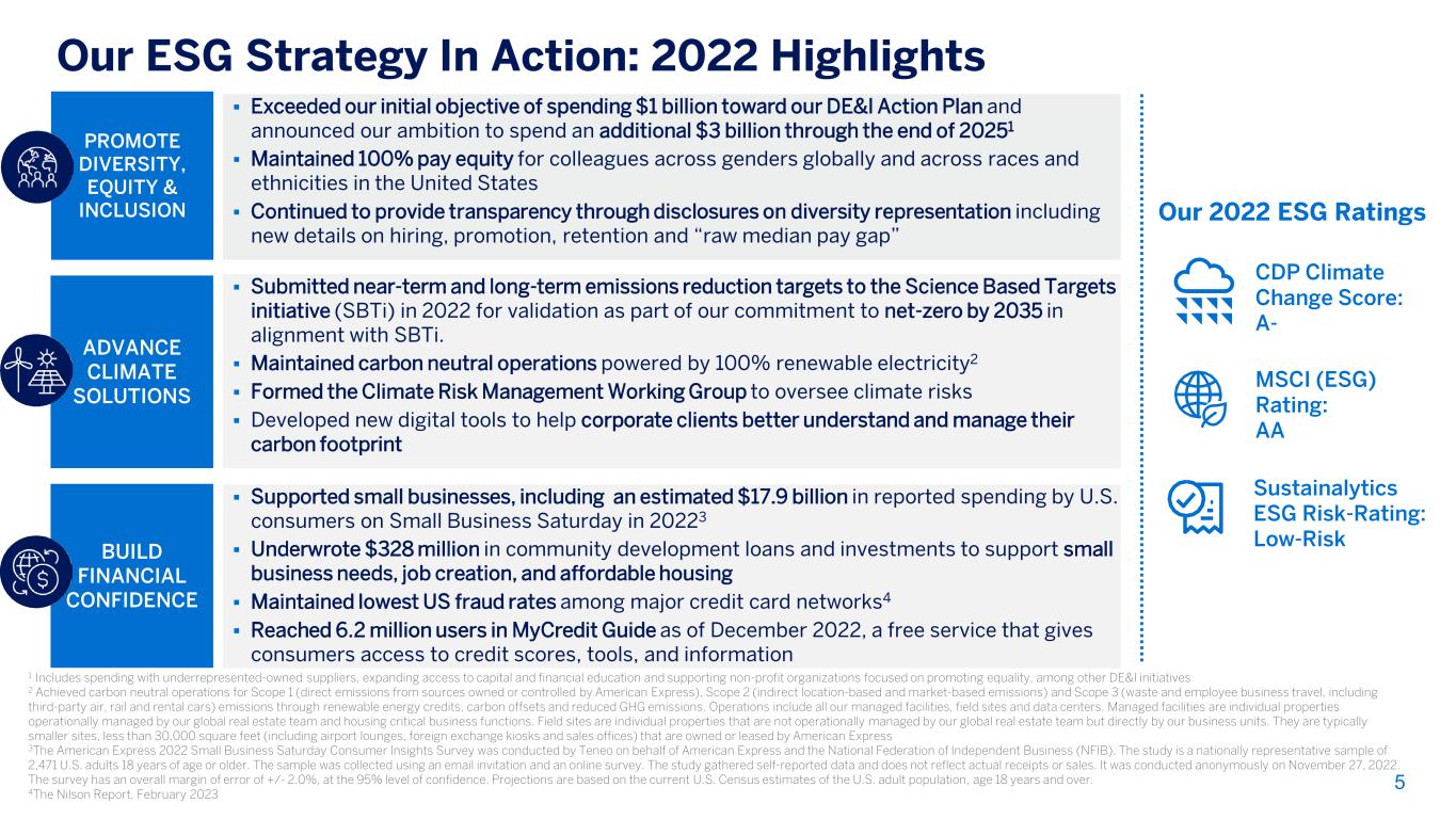 PROMOTE DIVERSITY, EQUITY & INCLUSION Exceeded our initial objective of spending $1 billion toward our DE&I Action Plan and announced our ambition to spend an additional $3 billion through the end of 20251 Maintained 100% pay equity for colleagues across genders globally and across races and ethnicities in the United States Continued to provide transparency through disclosures on diversity representation including new details on hiring, promotion, retention and “raw median pay gap” Our ESG Strategy In Action: 2022 Highlights Supported small businesses, including an estimated $17.9 billion in reported spending by U.S. consumers on Small Business Saturday in 20223 Underwrote $328 million in community development loans and investments to support small business needs, job creation, and affordable housing Maintained lowest US fraud rates among major credit card networks4 Reached 6.2 million users in MyCredit Guide as of December 2022, a free service that gives consumers access to credit scores, tools, and information Submitted near-term and long-term emissions reduction targets to the Science Based Targets initiative (SBTi) in 2022 for validation as part of our commitment to net-zero by 2035 in alignment with SBTi. Maintained carbon neutral operations powered by 100% renewable electricity2 Formed the Climate Risk Management Working Group to oversee climate risks Developed new digital tools to help corporate clients better understand and manage their carbon footprint 1 Includes spending with underrepresented-owned suppliers, expanding access to capital and financial education and supporting non-profit organizations focused on promoting equality, among other DE&I initiatives 2 Achieved carbon neutral operations for Scope 1 (direct emissions from sources owned or controlled by American Express), Scope 2 (indirect location-based and market-based emissions) and Scope 3 (waste and employee business travel, including third-party air, rail and rental cars) emissions through renewable energy credits, carbon offsets and reduced GHG emissions. Operations include all our managed facilities, field sites and data centers. Managed facilities are individual properties operationally managed by our global real estate team and housing critical business functions. Field sites are individual properties that are not operationally managed by our global real estate team but directly by our business units. They are typically smaller sites, less than 30,000 square feet (including airport lounges, foreign exchange kiosks and sales offices) that are owned or leased by American Express 3The American Express 2022 Small Business Saturday Consumer Insights Survey was conducted by Teneo on behalf of American Express and the National Federation of Independent Business (NFIB). The study is a nationally representative sample of 2,471 U.S. adults 18 years of age or older. The sample was collected using an email invitation and an online survey. The study gathered self-reported data and does not reflect actual receipts or sales. It was conducted anonymously on November 27, 2022. The survey has an overall margin of error of +/- 2.0%, at the 95% level of confidence. Projections are based on the current U.S. Census estimates of the U.S. adult population, age 18 years and over. 4The Nilson Report, February 2023 ADVANCE CLIMATE SOLUTIONS BUILD FINANCIAL CONFIDENCE Our 2022 ESG Ratings CDP Climate Change Score: A- MSCI (ESG) Rating: AA Sustainalytics ESG Risk-Rating: Low-Risk 5