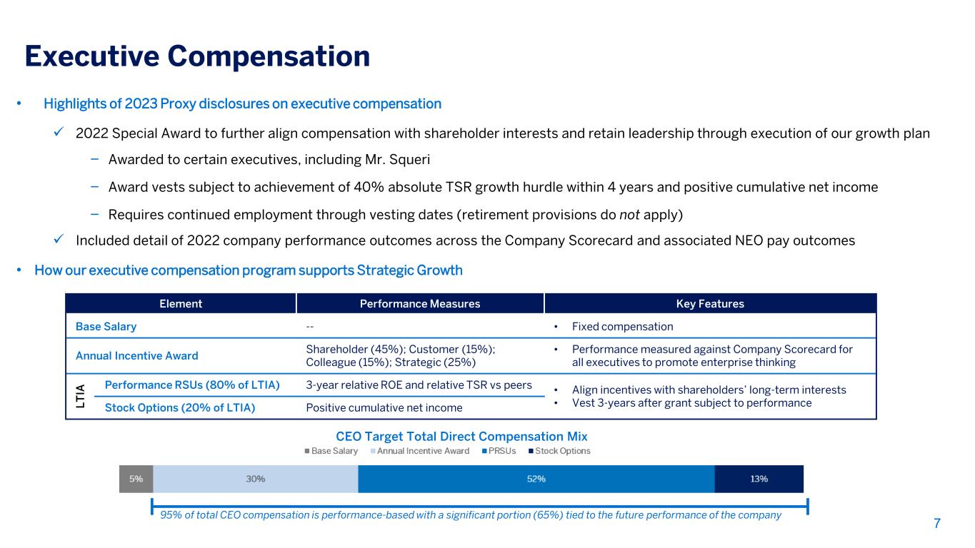 • Highlights of 2023 Proxy disclosures on executive compensation 2022 Special Award to further align compensation with shareholder interests and retain leadership through execution of our growth plan − Awarded to certain executives, including Mr. Squeri − Award vests subject to achievement of 40% absolute TSR growth hurdle within 4 years and positive cumulative net income − Requires continued employment through vesting dates (retirement provisions do not apply) Included detail of 2022 company performance outcomes across the Company Scorecard and associated NEO pay outcomes • How our executive compensation program supports Strategic Growth Executive Compensation Element Performance Measures Key Features Base Salary -- • Fixed compensation Annual Incentive Award Shareholder (45%); Customer (15%); Colleague (15%); Strategic (25%) • Performance measured against Company Scorecard for all executives to promote enterprise thinking LT IA Performance RSUs (80% of LTIA) 3-year relative ROE and relative TSR vs peers • Align incentives with shareholders’ long-term interests • Vest 3-years after grant subject to performanceStock Options (20% of LTIA) Positive cumulative net income CEO Target Total Direct Compensation Mix 95% of total CEO compensation is performance-based with a significant portion (65%) tied to the future performance of the company 7