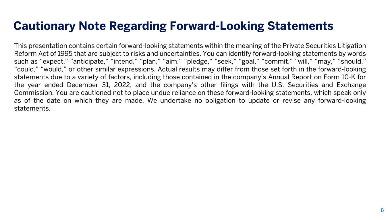 This presentation contains certain forward-looking statements within the meaning of the Private Securities Litigation Reform Act of 1995 that are subject to risks and uncertainties. You can identify forward-looking statements by words such as “expect,” “anticipate,” “intend,” “plan,” “aim,” “pledge,” “seek,” “goal,” “commit,” “will,” “may,” “should,” “could,” “would,” or other similar expressions. Actual results may differ from those set forth in the forward-looking statements due to a variety of factors, including those contained in the company’s Annual Report on Form 10-K for the year ended December 31, 2022, and the company’s other filings with the U.S. Securities and Exchange Commission. You are cautioned not to place undue reliance on these forward-looking statements, which speak only as of the date on which they are made. We undertake no obligation to update or revise any forward-looking statements. Cautionary Note Regarding Forward-Looking Statements 8
