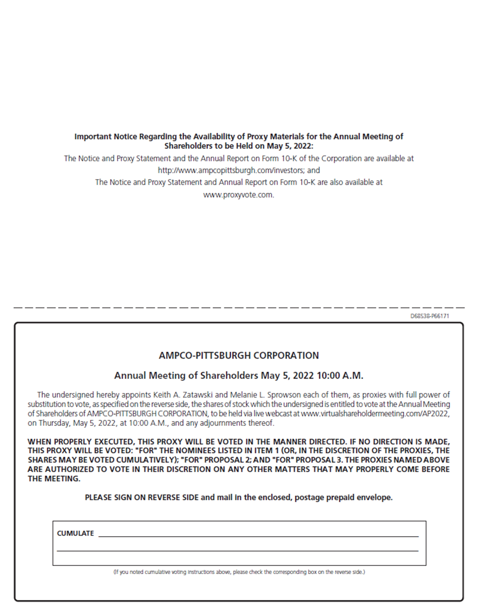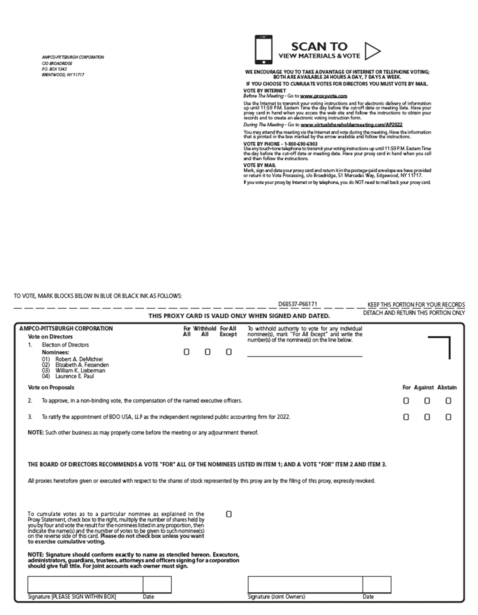 Regardless of the number of shares of Common Stock of the Corporation that you own, your vote is important. Thank you for your continued support, interest and investment in Ampco-Pittsburgh Corporation.