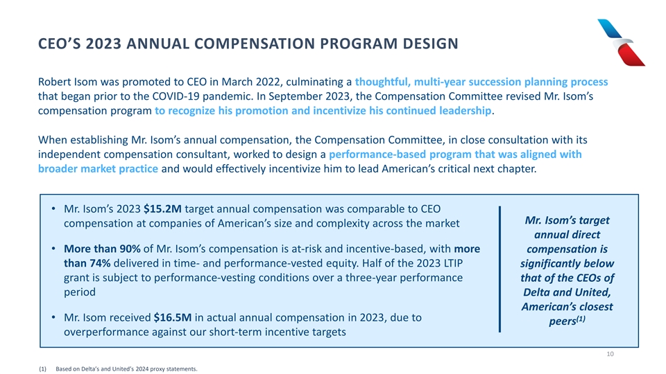 January 1, 2020 CEO’S COMPENSATION REFLECTS PROMOTION AND INDUSTRY DISRUPTIONS The compensation delivered to our CEO in 2023 reflects the challenging circumstances of the past few years 2020 – 2022 The most challenging time in our industry’s history, as the COVID-19 pandemic causes drastic disruptions in global demand for air travel; American’s executive officers take a significant pay reduction in Q2 2020 at the onset of the pandemic and do not receive STIP payouts in 2020 or 2021; American executives take a leadership role working with Congress to ensure the survival of the airline industry amid a crippling environment; (1) American reverses pre-tax loss of nearly $7B in 2021 to pre-tax income of $458M in 2022 March 2022 Robert Isom is promoted to CEO, culminating a robust leadership team succession planning process that began prior to the pandemic; due to CARES Act caps, his 2022 compensation remains capped at $5.0 million, considerably below what his CEO peers at Delta and United earned in 2022 and well below what he received as President in 2019 ($7.1 million) April 2023 CARES Act restrictions lapse September 2023 Following a year-long process in close consultation with its independent compensation consultant, the Compensation Committee revises Mr. Isom’s compensation to compensate him fairly and appropriately for his service as CEO, including relative to his peers at Delta and United, and to appropriately incentivize his leadership in overseeing the positive business momentum following the Company’s successful post-pandemic transformation American took a leadership role in securing support for the airline industry during the pandemic; the Company grappled with how to incentivize and reward our leaders as they led the Company through the most challenging period in airline history 9 (1) Excluding pre-tax net special items.