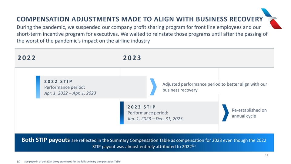 January 1, 2020 CEO’S 2023 ANNUAL COMPENSATION PROGRAM DESIGN Robert Isom was promoted to CEO in March 2022, culminating a thoughtful, multi-year succession planning process that began prior to the COVID-19 pandemic. In September 2023, the Compensation Committee revised Mr. Isom’s compensation program to recognize his promotion and incentivize his continued leadership. When establishing Mr. Isom’s annual compensation, the Compensation Committee, in close consultation with its independent compensation consultant, worked to design a performance-based program that was aligned with broader market practice and would effectively incentivize him to lead American’s critical next chapter. • Mr. Isom’s 2023 $15.2M target annual compensation was comparable to CEO Mr. Isom’s target compensation at companies of American’s size and complexity across the market annual direct • More than 90% of Mr. Isom’s compensation is at-risk and incentive-based, with more compensation is than 74% delivered in time- and performance-vested equity. Half of the 2023 LTIP significantly below grant is subject to performance-vesting conditions over a three-year performance that of the CEOs of period Delta and United, American’s closest • Mr. Isom received $16.5M in actual annual compensation in 2023, due to (1) peers overperformance against our short-term incentive targets 10 (1) Based on Delta’s and United’s 2024 proxy statements.