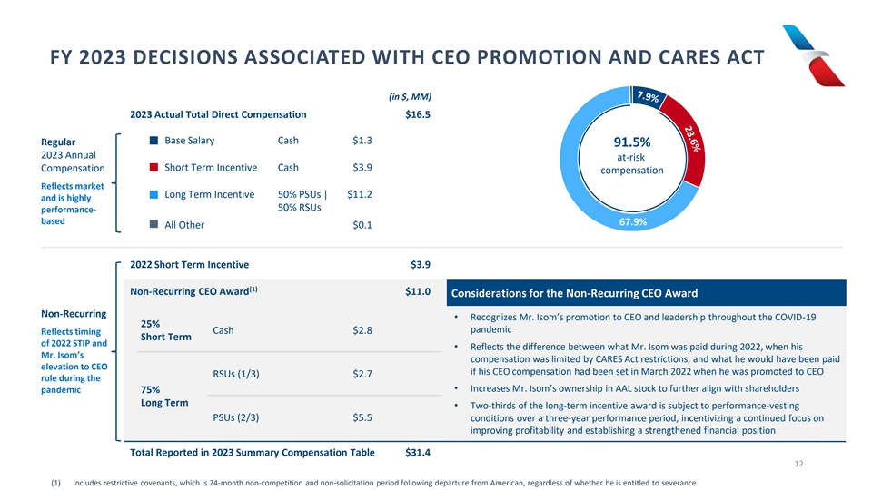 January 1, 2020 COMPENSATION ADJUSTMENTS MADE TO ALIGN WITH BUSINESS RECOVERY During the pandemic, we suspended our company profit sharing program for front line employees and our short-term incentive program for executives. We waited to reinstate those programs until after the passing of the worst of the pandemic’s impact on the airline industry 2022 2023 2 0 2 2 S T I P Adjusted performance period to better align with our Performance period: business recovery Apr. 1, 2022 – Apr. 1, 2023 2 0 2 3 S T I P Re-established on Performance period: annual cycle Jan. 1, 2023 – Dec. 31, 2023 Both STIP payouts are reflected in the Summary Compensation Table as compensation for 2023 even though the 2022 (1) STIP payout was almost entirely attributed to 2022 11 (1) See page 64 of our 2024 proxy statement for the full Summary Compensation Table.