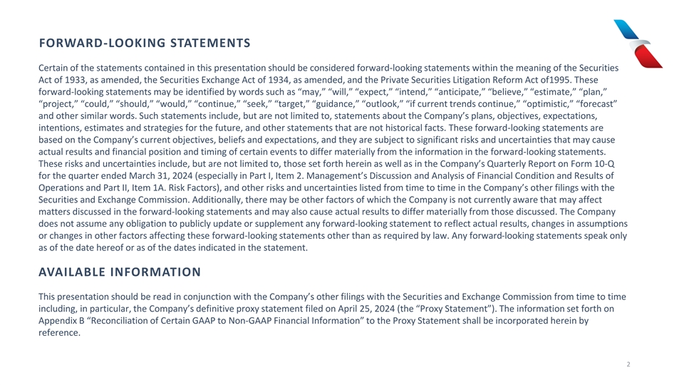 January 1, 2020 FORWARD-LOOKING STATEMENTS Certain of the statements contained in this presentation should be considered forward-looking statements within the meaning of the Securities Act of 1933, as amended, the Securities Exchange Act of 1934, as amended, and the Private Securities Litigation Reform Act of1995. These forward-looking statements may be identified by words such as “may,” “will,” “expect,” “intend,” “anticipate,” “believe,” “estimate,” “plan,” “project,” “could,” “should,” “would,” “continue,” “seek,” “target,” “guidance,” “outlook,” “if current trends continue,” “optimistic,” “forecast” and other similar words. Such statements include, but are not limited to, statements about the Company’s plans, objectives, expectations, intentions, estimates and strategies for the future, and other statements that are not historical facts. These forward-looking statements are based on the Company’s current objectives, beliefs and expectations, and they are subject to significant risks and uncertainties that may cause actual results and financial position and timing of certain events to differ materially from the information in the forward-looking statements. These risks and uncertainties include, but are not limited to, those set forth herein as well as in the Company’s Quarterly Report on Form 10-Q for the quarter ended March 31, 2024 (especially in Part I, Item 2. Management’s Discussion and Analysis of Financial Condition and Results of Operations and Part II, Item 1A. Risk Factors), and other risks and uncertainties listed from time to time in the Company’s other filings with the Securities and Exchange Commission. Additionally, there may be other factors of which the Company is not currently aware that may affect matters discussed in the forward-looking statements and may also cause actual results to differ materially from those discussed. The Company does not assume any obligation to publicly update or supplement any forward-looking statement to reflect actual results, changes in assumptions or changes in other factors affecting these forward-looking statements other than as required by law. Any forward-looking statements speak only as of the date hereof or as of the dates indicated in the statement. AVAILABLE INFORMATION This presentation should be read in conjunction with the Company’s other filings with the Securities and Exchange Commission from time to time including, in particular, the Company’s definitive proxy statement filed on April 25, 2024 (the “Proxy Statement”). The information set forth on Appendix B “Reconciliation of Certain GAAP to Non-GAAP Financial Information” to the Proxy Statement shall be incorporated herein by reference. 2