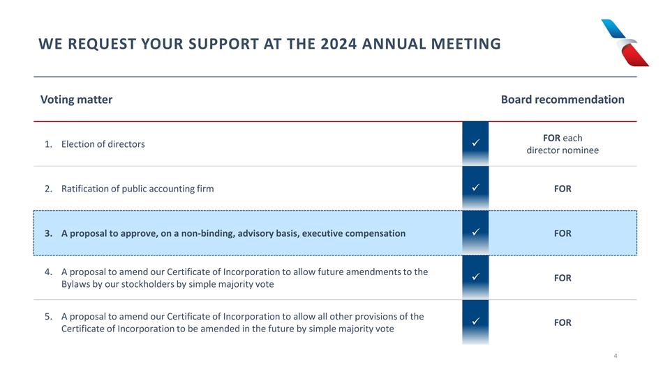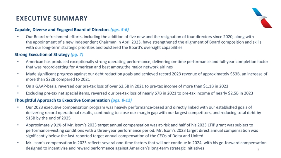 January 1, 2020 EXECUTIVE SUMMARY Capable, Diverse and Engaged Board of Directors (pgs. 5-6) • Our Board refreshment efforts, including the addition of five new and the resignation of four directors since 2020, along with the appointment of a new Independent Chairman in April 2023, have strengthened the alignment of Board composition and skills with our long-term strategic priorities and bolstered the Board’s oversight capabilities Strong Execution of Strategy (pg. 7) • American has produced exceptionally strong operating performance, delivering on-time performance and full-year completion factor that was record-setting for American and best among the major network airlines • Made significant progress against our debt reduction goals and achieved record 2023 revenue of approximately $53B, an increase of more than $22B compared to 2021 • On a GAAP-basis, reversed our pre-tax loss of over $2.5B in 2021 to pre-tax income of more than $1.1B in 2023 • Excluding pre-tax net special items, reversed our pre-tax loss of nearly $7B in 2021 to pre-tax income of nearly $2.5B in 2023 Thoughtful Approach to Executive Compensation (pgs. 8-12) • Our 2023 executive compensation program was heavily performance-based and directly linked with our established goals of delivering record operational results, continuing to close our margin gap with our largest competitors, and reducing total debt by $15B by the end of 2025 • Approximately 91% of Mr. Isom’s 2023 target annual compensation was at-risk and half of his 2023 LTIP grant was subject to performance-vesting conditions with a three-year performance period. Mr. Isom’s 2023 target direct annual compensation was significantly below the last-reported target annual compensation of the CEOs of Delta and United • Mr. Isom’s compensation in 2023 reflects several one-time factors that will not continue in 2024, with his go-forward compensation designed to incentivize and reward performance against American’s long-term strategic initiatives 3