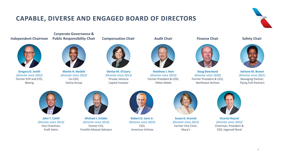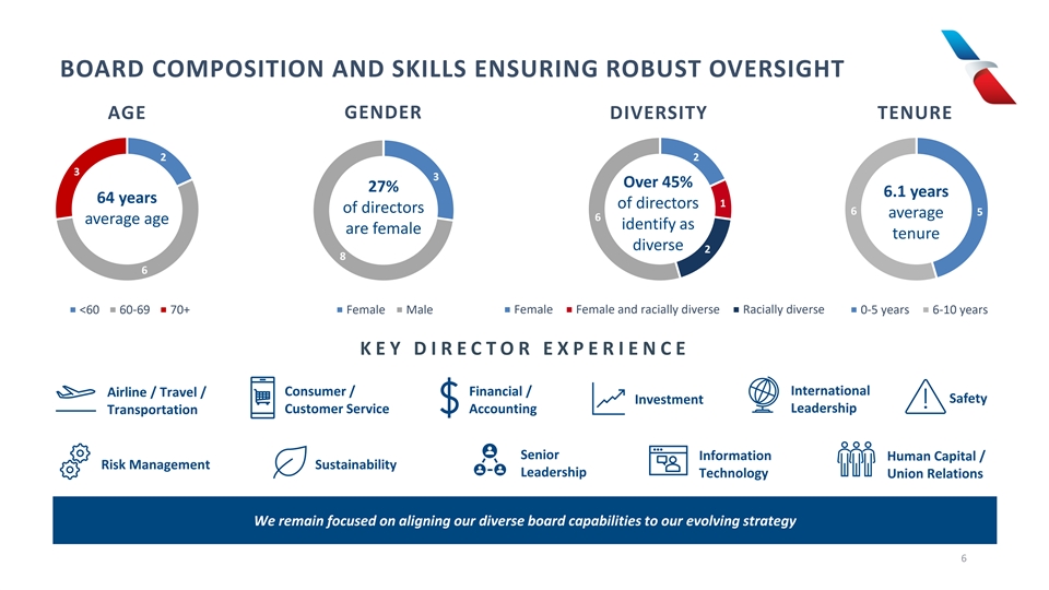 January 1, 2020 CAPABLE, DIVERSE AND ENGAGED BOARD OF DIRECTORS Corporate Governance & Independent Chairman Public Responsibility Chair Compensation Chair Audit Chair Finance Chair Safety Chair Gregory D. Smith Martin H. Nesbitt Denise M. O’Leary Matthew J. Hart Doug Steenland Adriane M. Brown (Director since 2022) (Director since 2015) (Director since 2013) (Director since 2013) (Director since 2020) (Director since 2021) Former EVP and CFO, Co-CEO, Private Venture Former President & COO, Former President & CEO, Managing Partner, Boeing Vistria Group Capital Investor Hilton Hotels Northwest Airlines Flying Fish Partners John T. Cahill Michael J. Embler Robert D. Isom Jr. Susan D. Kronick Vicente Reynal (Director since 2013) (Director since 2013) (Director since 2022) (Director since 2015) (Director since 2022) Vice Chairman, Former CIO, CEO, Former Vice Chair, Chairman, President & Kraft Heinz Franklin Mutual Advisors American Airlines Macy’s CEO, Ingersoll Rand 5