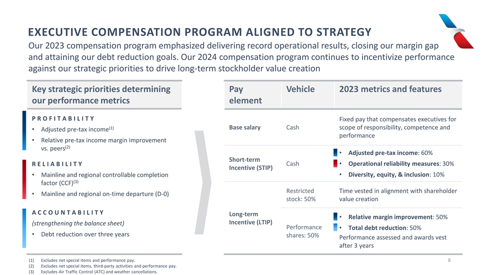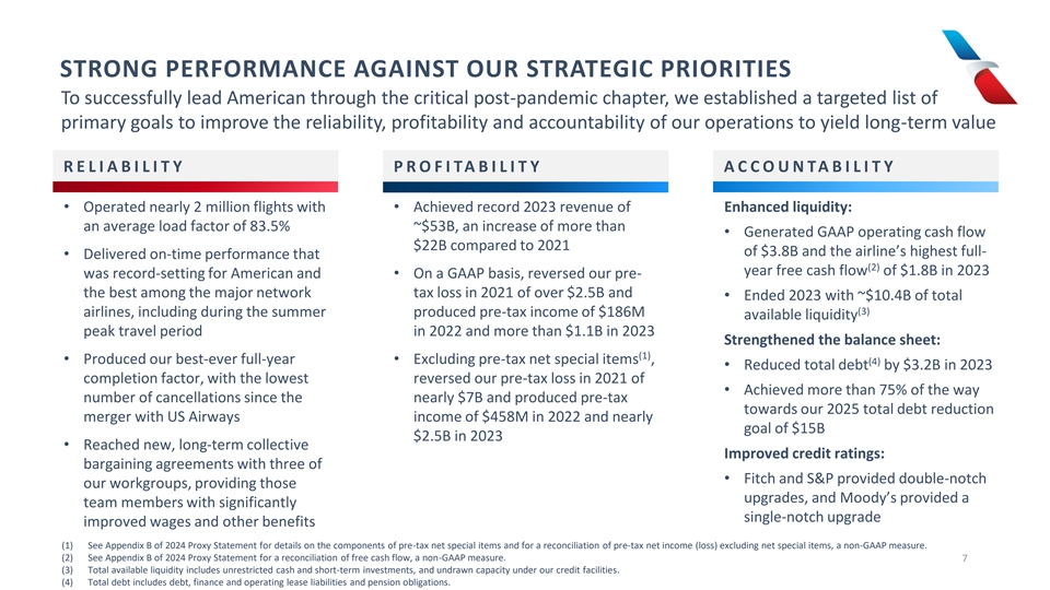 January 1, 2020 STRONG PERFORMANCE AGAINST OUR STRATEGIC PRIORITIES To successfully lead American through the critical post-pandemic chapter, we established a targeted list of primary goals to improve the reliability, profitability and accountability of our operations to yield long-term value R E L I A B I L I T Y P R O F I T A B I L I T Y A C C O U N T A B I L I T Y • Operated nearly 2 million flights with • Achieved record 2023 revenue of Enhanced liquidity: an average load factor of 83.5% ~$53B, an increase of more than • Generated GAAP operating cash flow $22B compared to 2021 of $3.8B and the airline’s highest full- • Delivered on-time performance that (2) year free cash flow of $1.8B in 2023 was record-setting for American and • On a GAAP basis, reversed our pre- the best among the major network tax loss in 2021 of over $2.5B and • Ended 2023 with ~$10.4B of total (3) airlines, including during the summer produced pre-tax income of $186M available liquidity peak travel period in 2022 and more than $1.1B in 2023 Strengthened the balance sheet: (1) • Produced our best-ever full-year • Excluding pre-tax net special items , (4) • Reduced total debt by $3.2B in 2023 completion factor, with the lowest reversed our pre-tax loss in 2021 of • Achieved more than 75% of the way number of cancellations since the nearly $7B and produced pre-tax towards our 2025 total debt reduction merger with US Airways income of $458M in 2022 and nearly goal of $15B $2.5B in 2023 • Reached new, long-term collective Improved credit ratings: bargaining agreements with three of • Fitch and S&P provided double-notch our workgroups, providing those upgrades, and Moody’s provided a team members with significantly single-notch upgrade improved wages and other benefits (1) See Appendix B of 2024 Proxy Statement for details on the components of pre-tax net special items and for a reconciliation of pre-tax net income (loss) excluding net special items, a non-GAAP measure. (2) See Appendix B of 2024 Proxy Statement for a reconciliation of free cash flow, a non-GAAP measure. 7 (3) Total available liquidity includes unrestricted cash and short-term investments, and undrawn capacity under our credit facilities. (4) Total debt includes debt, finance and operating lease liabilities and pension obligations.