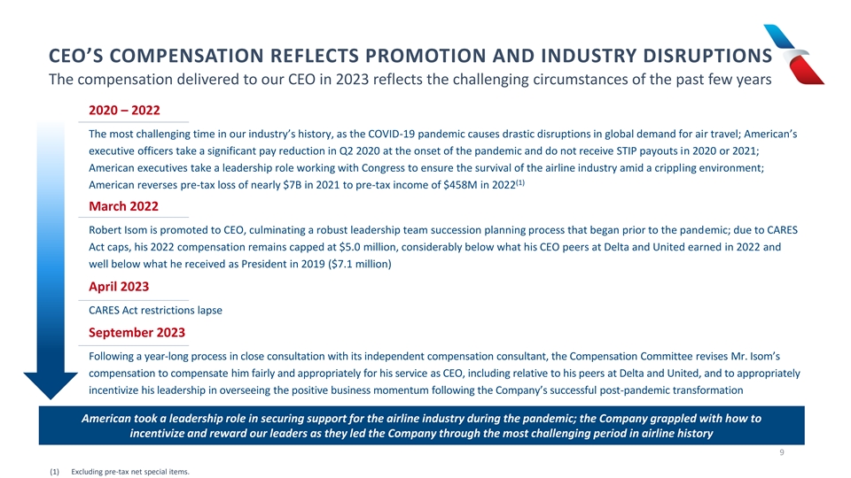 January 1, 2020 EXECUTIVE COMPENSATION PROGRAM ALIGNED TO STRATEGY Our 2023 compensation program emphasized delivering record operational results, closing our margin gap and attaining our debt reduction goals. Our 2024 compensation program continues to incentivize performance against our strategic priorities to drive long-term stockholder value creation Key strategic priorities determining Pay Vehicle 2023 metrics and features our performance metrics element P R O F I T A B I L I T Y Fixed pay that compensates executives for (1) Base salary Cash scope of responsibility, competence and • Adjusted pre-tax income performance • Relative pre-tax income margin improvement (2) vs. peers • Adjusted pre-tax income: 60% Short-term Cash• Operational reliability measures: 30% R E L I A B I L I T Y Incentive (STIP) • Diversity, equity, & inclusion: 10% • Mainline and regional controllable completion (3) factor (CCF) Restricted Time vested in alignment with shareholder • Mainline and regional on-time departure (D-0) stock: 50% value creation A C C O U N T A B I L I T Y Long-term • Relative margin improvement: 50% Incentive (LTIP) (strengthening the balance sheet) Performance • Total debt reduction: 50% • Debt reduction over three years shares: 50% Performance assessed and awards vest after 3 years (1) Excludes net special items and performance pay. 8 (2) Excludes net special items, third-party activities and performance pay. (3) Excludes Air Traffic Control (ATC) and weather cancellations.