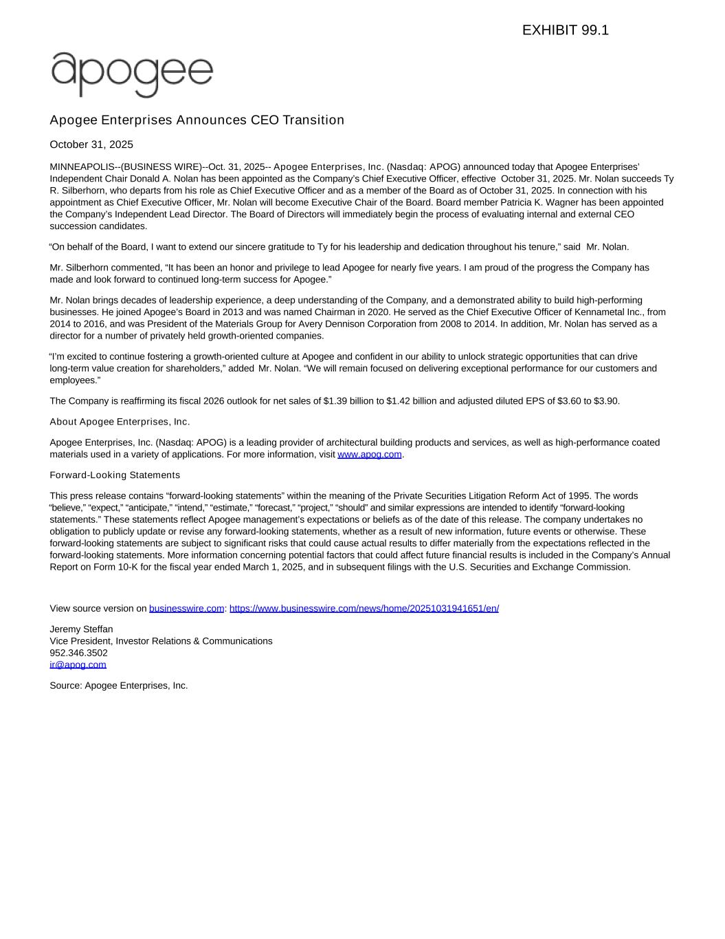 Apogee Enterprises Announces CEO Transition October 31, 2025 MINNEAPOLIS--(BUSINESS WIRE)--Oct. 31, 2025-- Apogee Enterprises, Inc. (Nasdaq: APOG) announced today that Apogee Enterprises’ Independent Chair Donald A. Nolan has been appointed as the Company’s Chief Executive Officer, effective October 31, 2025. Mr. Nolan succeeds Ty R. Silberhorn, who departs from his role as Chief Executive Officer and as a member of the Board as of October 31, 2025. In connection with his appointment as Chief Executive Officer, Mr. Nolan will become Executive Chair of the Board. Board member Patricia K. Wagner has been appointed the Company’s Independent Lead Director. The Board of Directors will immediately begin the process of evaluating internal and external CEO succession candidates. “On behalf of the Board, I want to extend our sincere gratitude to Ty for his leadership and dedication throughout his tenure,” said Mr. Nolan. Mr. Silberhorn commented, “It has been an honor and privilege to lead Apogee for nearly five years. I am proud of the progress the Company has made and look forward to continued long-term success for Apogee.” Mr. Nolan brings decades of leadership experience, a deep understanding of the Company, and a demonstrated ability to build high-performing businesses. He joined Apogee’s Board in 2013 and was named Chairman in 2020. He served as the Chief Executive Officer of Kennametal Inc., from 2014 to 2016, and was President of the Materials Group for Avery Dennison Corporation from 2008 to 2014. In addition, Mr. Nolan has served as a director for a number of privately held growth-oriented companies. “I’m excited to continue fostering a growth-oriented culture at Apogee and confident in our ability to unlock strategic opportunities that can drive long-term value creation for shareholders,” added Mr. Nolan. “We will remain focused on delivering exceptional performance for our customers and employees.” The Company is reaffirming its fiscal 2026 outlook for net sales of $1.39 billion to $1.42 billion and adjusted diluted EPS of $3.60 to $3.90. About Apogee Enterprises, Inc. Apogee Enterprises, Inc. (Nasdaq: APOG) is a leading provider of architectural building products and services, as well as high-performance coated materials used in a variety of applications. For more information, visit www.apog.com. Forward-Looking Statements This press release contains “forward-looking statements” within the meaning of the Private Securities Litigation Reform Act of 1995. The words “believe,” “expect,” “anticipate,” “intend,” “estimate,” “forecast,” “project,” “should” and similar expressions are intended to identify “forward-looking statements.” These statements reflect Apogee management’s expectations or beliefs as of the date of this release. The company undertakes no obligation to publicly update or revise any forward-looking statements, whether as a result of new information, future events or otherwise. These forward-looking statements are subject to significant risks that could cause actual results to differ materially from the expectations reflected in the forward-looking statements. More information concerning potential factors that could affect future financial results is included in the Company’s Annual Report on Form 10-K for the fiscal year ended March 1, 2025, and in subsequent filings with the U.S. Securities and Exchange Commission. View source version on businesswire.com: https://www.businesswire.com/news/home/20251031941651/en/ Jeremy Steffan Vice President, Investor Relations & Communications 952.346.3502 ir@apog.com Source: Apogee Enterprises, Inc.