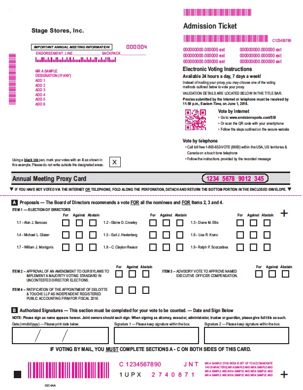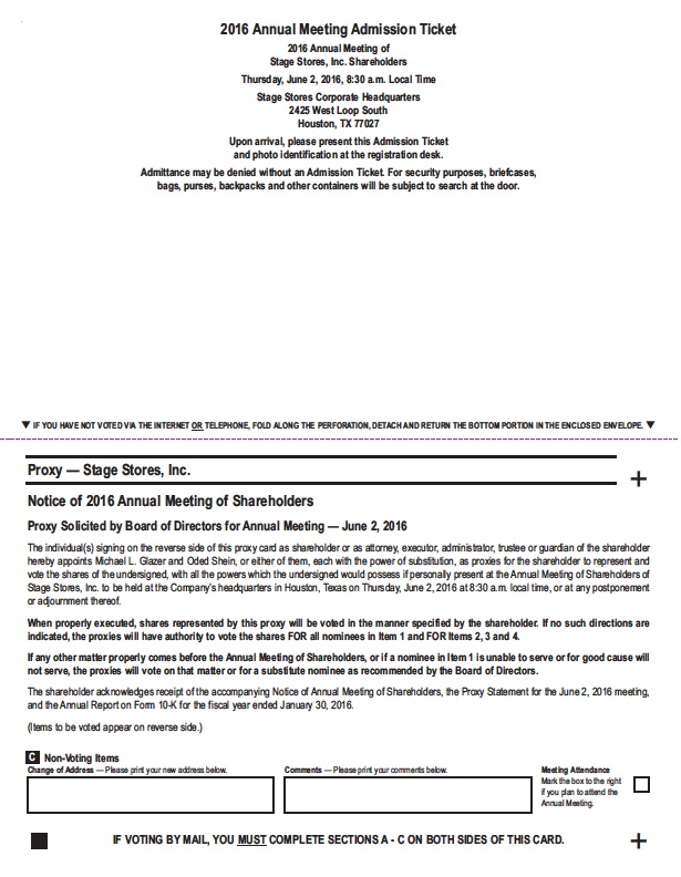 The 2016 Annual Meeting of Shareholders of Stage Stores, Inc. will be held at our corporate office located at 2425 West Loop South, Houston, Texas 77027 on June 2, 2016, beginning at 8:30 a.m. CDT, for the following purposes: