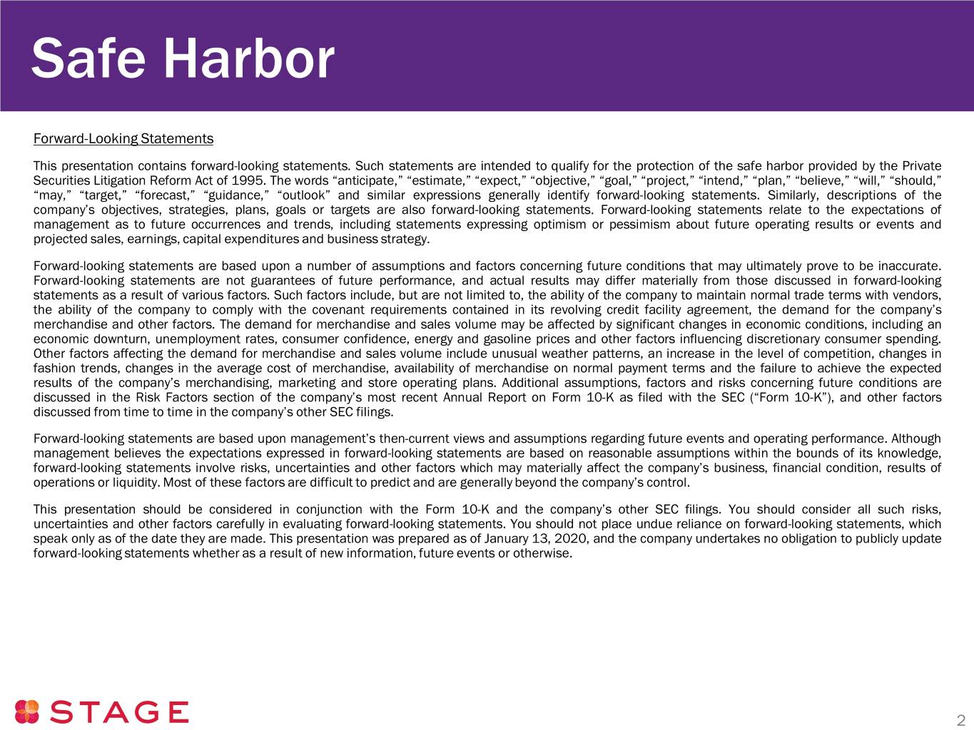 Safe Harbor Forward-Looking Statements This presentation contains forward-looking statements. Such statements are intended to qualify for the protection of the safe harbor provided by the Private Securities Litigation Reform Act of 1995. The words “anticipate,” “estimate,” “expect,” “objective,” “goal,” “project,” “intend,” “plan,” “believe,” “will,” “should,” “may,” “target,” “forecast,” “guidance,” “outlook” and similar expressions generally identify forward-looking statements. Similarly, descriptions of the company’s objectives, strategies, plans, goals or targets are also forward-looking statements. Forward-looking statements relate to the expectations of management as to future occurrences and trends, including statements expressing optimism or pessimism about future operating results or events and projected sales, earnings, capital expenditures and business strategy. Forward-looking statements are based upon a number of assumptions and factors concerning future conditions that may ultimately prove to be inaccurate. Forward-looking statements are not guarantees of future performance, and actual results may differ materially from those discussed in forward-looking statements as a result of various factors. Such factors include, but are not limited to, the ability of the company to maintain normal trade terms with vendors, the ability of the company to comply with the covenant requirements contained in its revolving credit facility agreement, the demand for the company’s merchandise and other factors. The demand for merchandise and sales volume may be affected by significant changes in economic conditions, including an economic downturn, unemployment rates, consumer confidence, energy and gasoline prices and other factors influencing discretionary consumer spending. Other factors affecting the demand for merchandise and sales volume include unusual weather patterns, an increase in the level of competition, changes in fashion trends, changes in the average cost of merchandise, availability of merchandise on normal payment terms and the failure to achieve the expected results of the company’s merchandising, marketing and store operating plans. Additional assumptions, factors and risks concerning future conditions are discussed in the Risk Factors section of the company’s most recent Annual Report on Form 10-K as filed with the SEC (“Form 10-K”), and other factors discussed from time to time in the company’s other SEC filings. Forward-looking statements are based upon management’s then-current views and assumptions regarding future events and operating performance. Although management believes the expectations expressed in forward-looking statements are based on reasonable assumptions within the bounds of its knowledge, forward-looking statements involve risks, uncertainties and other factors which may materially affect the company’s business, financial condition, results of operations or liquidity. Most of these factors are difficult to predict and are generally beyond the company’s control. This presentation should be considered in conjunction with the Form 10-K and the company’s other SEC filings. You should consider all such risks, uncertainties and other factors carefully in evaluating forward-looking statements. You should not place undue reliance on forward-looking statements, which speak only as of the date they are made. This presentation was prepared as of January 13, 2020, and the company undertakes no obligation to publicly update forward-looking statements whether as a result of new information, future events or otherwise. 2