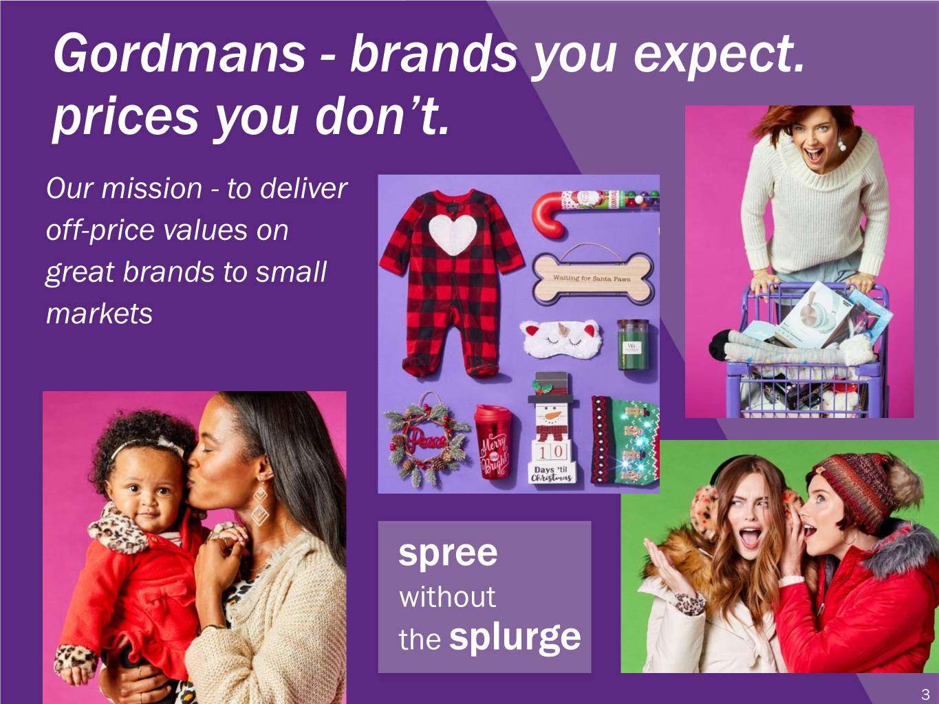 Gordmans - brands you expect. prices you don’t. Our mission - to deliver off-price values on great brands to small markets spree without the splurge 3