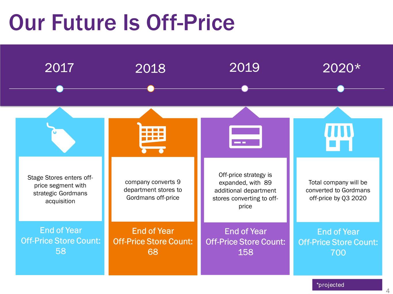 Our Future Is Off-Price 2017 2018 2019 2020* Stage Stores enters off- Off-price strategy is company converts 9 price segment with expanded, with 89 Total company will be department stores to strategic Gordmans additional department converted to Gordmans Gordmans off-price acquisition stores converting to off- off-price by Q3 2020 price End of Year End of Year End of Year End of Year Off-Price Store Count: Off-Price Store Count: Off-Price Store Count: Off-Price Store Count: 58 68 158 700 *projected 4