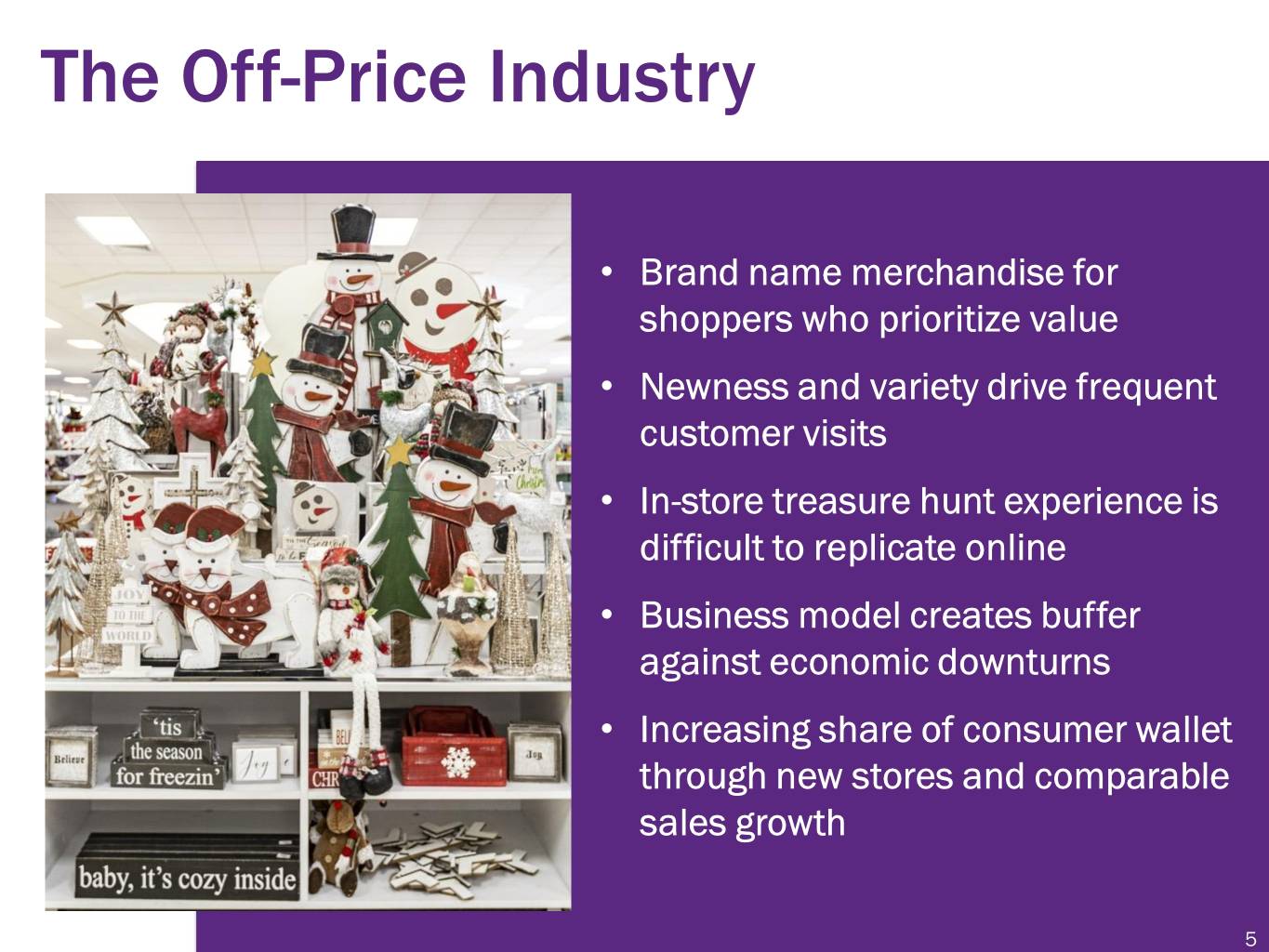 The Off-Price Industry Growing retail sector with• 5 Brandyear revenue name +43%merchandise by 2021* for shoppers who prioritize value Increasing industry brick• andNewness mortar locations and variety with drivelong frequent term store target of 7,500, customerup 49% from visits mid 2017* • In-store treasure hunt experience is difficult to replicate online • Business model creates buffer against economic downturns • Increasing share of consumer wallet through new stores and comparable 5 sales growth 55