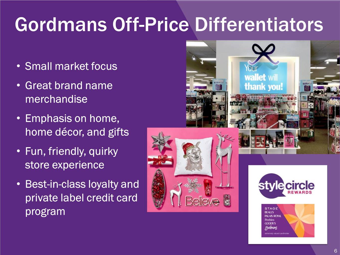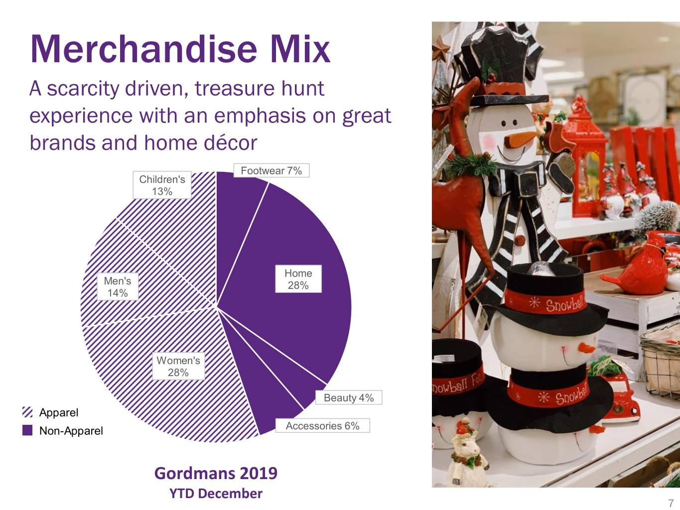 Merchandise Mix A scarcity driven, treasure hunt experience with an emphasis on great brands and home décor Footwear 7% Children's 13% Home Men's 28% 14% Women's 28% Beauty 4% Apparel Non-Apparel Accessories 6% Gordmans 2019 YTD December 7