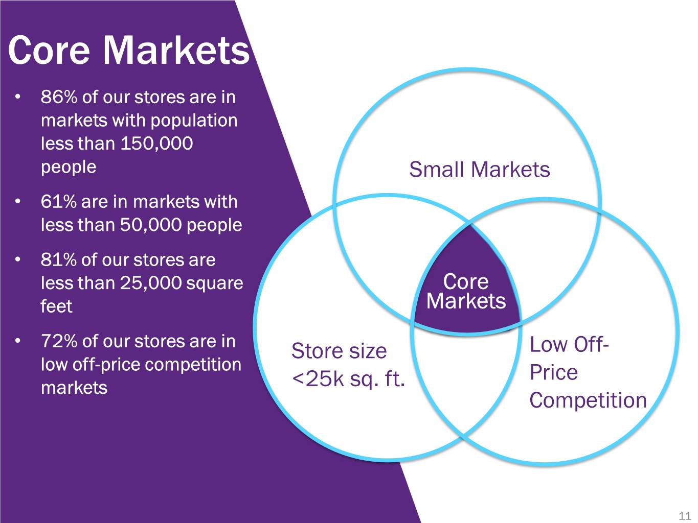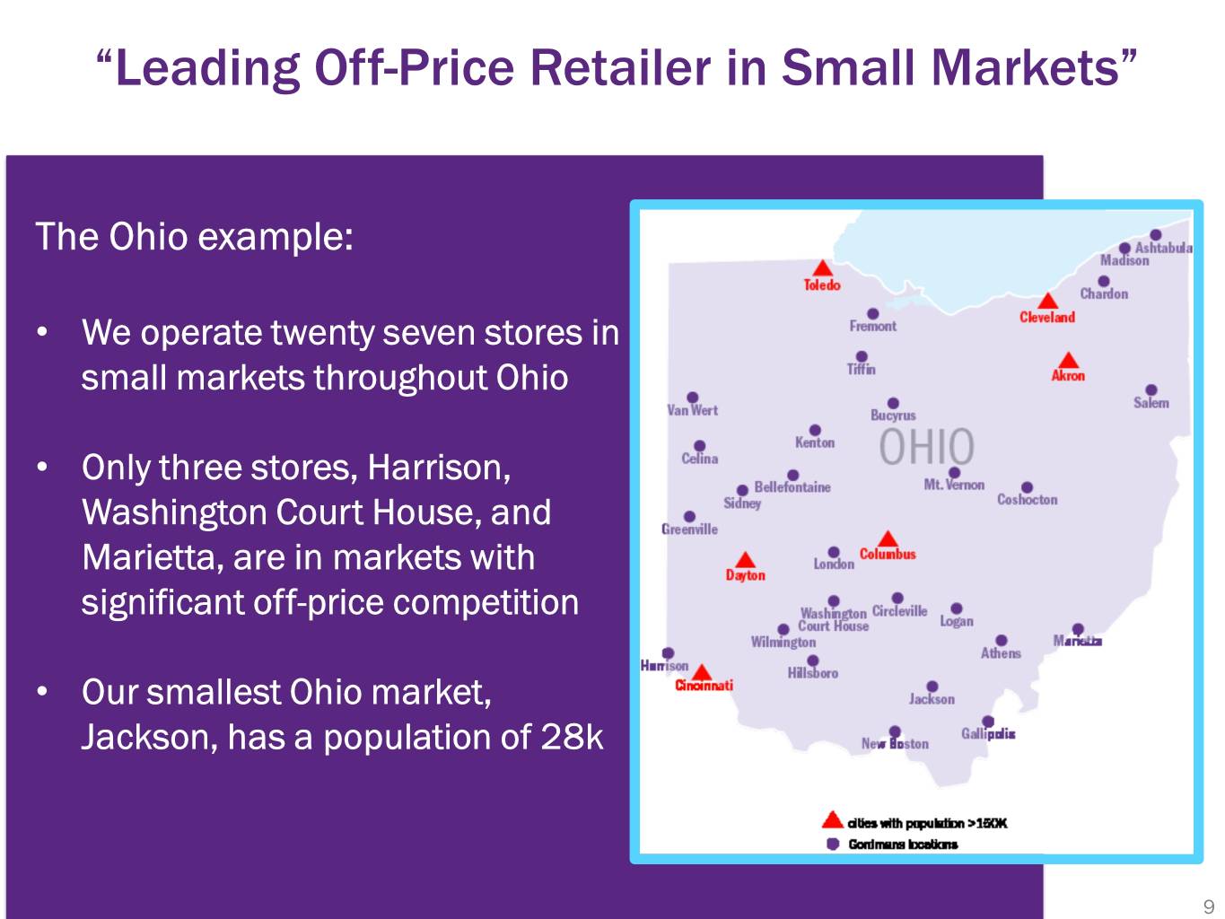“Leading Off-Price Retailer in Small Markets” The Ohio example: • We operate twenty seven stores in small markets throughout Ohio • Only three stores, Harrison, Washington Court House, and Marietta, are in markets with significant off-price competition • Our smallest Ohio market, Jackson, has a population of 28k 9