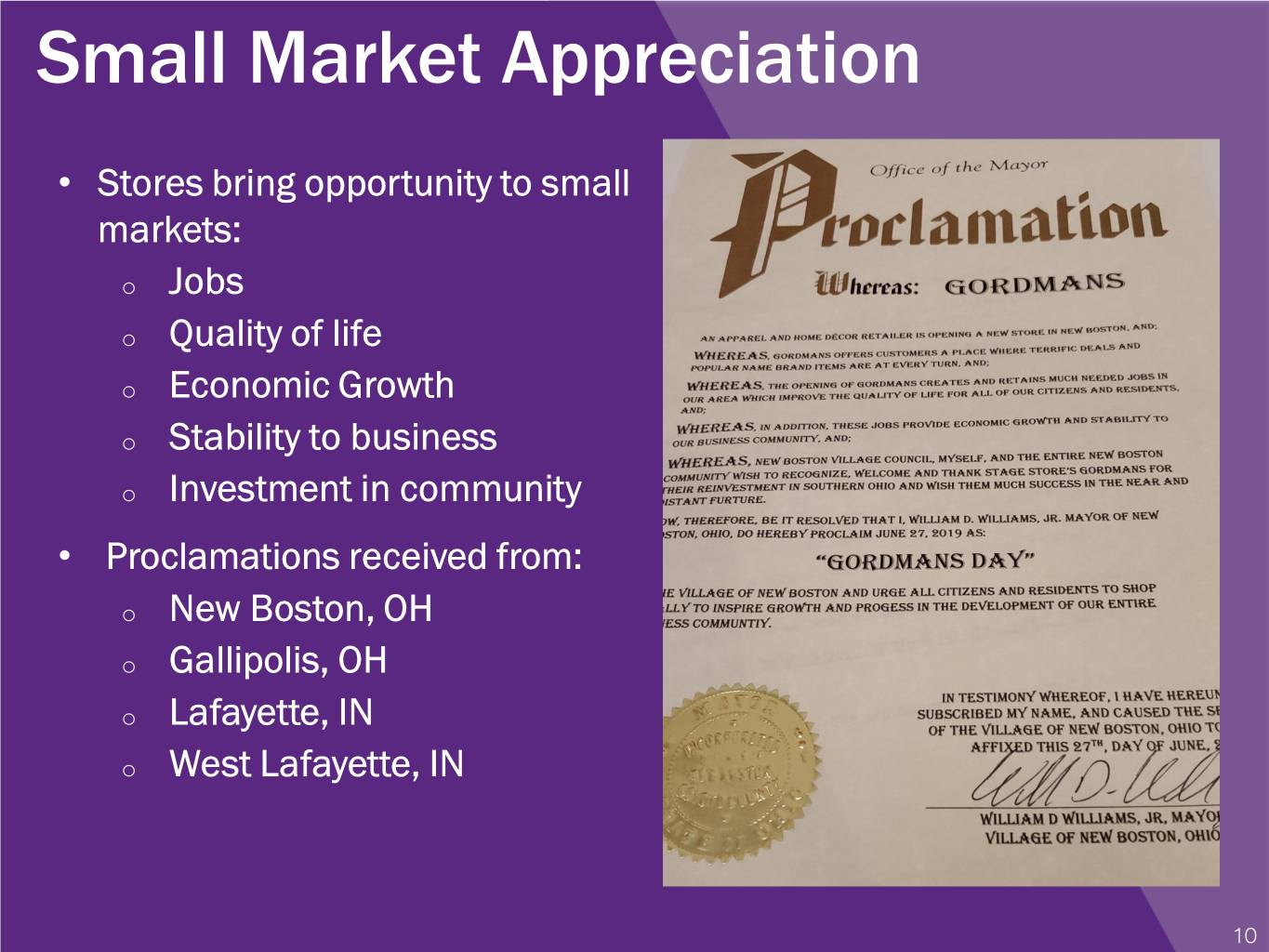 Small Market Appreciation • Stores bring opportunity to small markets: o Jobs o Quality of life o Economic Growth o Stability to business o Investment in community • Proclamations received from: o New Boston, OH o Gallipolis, OH o Lafayette, IN o West Lafayette, IN 10