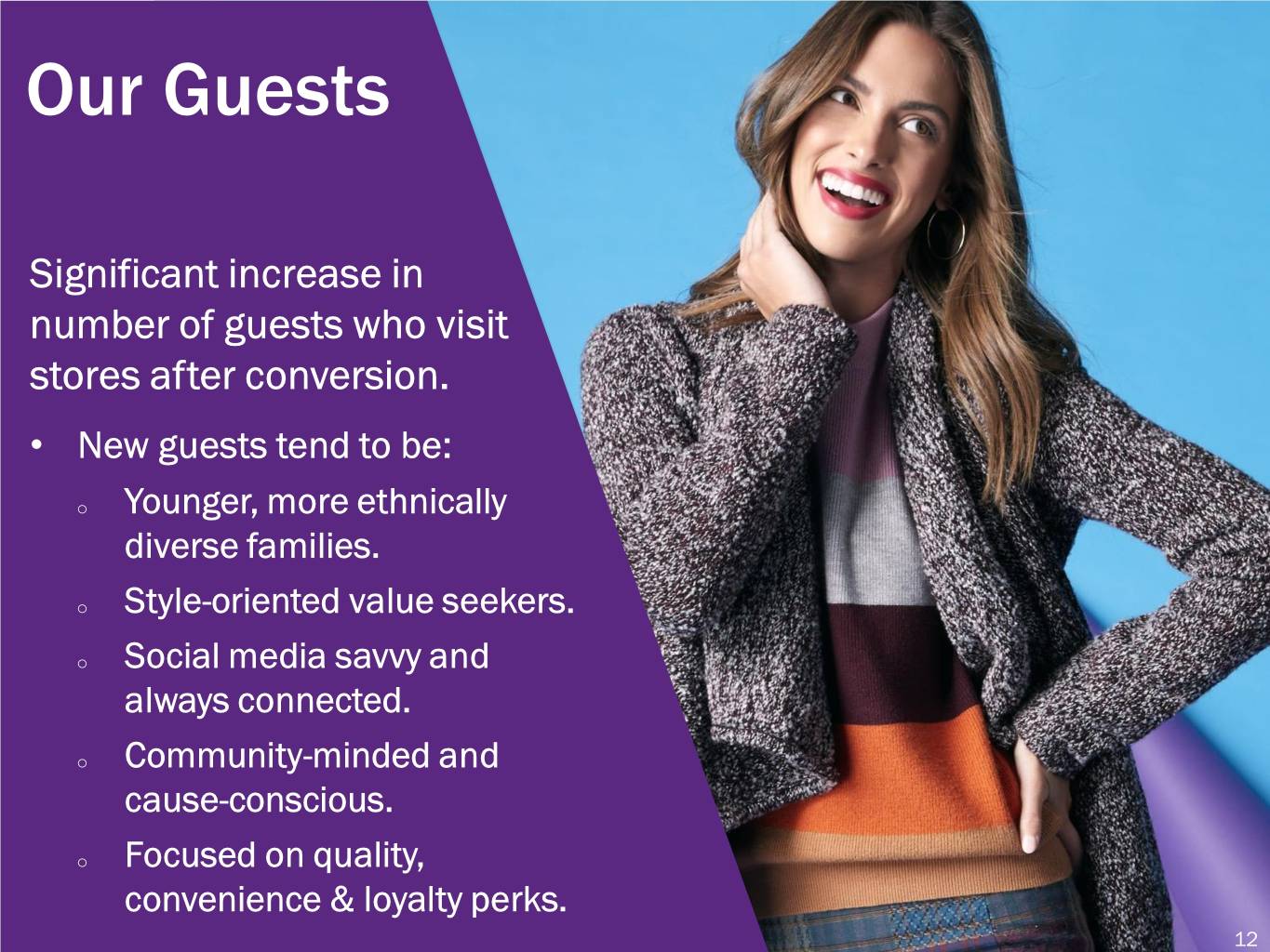 Our Guests Significant increase in number of guests who visit stores after conversion. • New guests tend to be: o Younger, more ethnically diverse families. o Style-oriented value seekers. o Social media savvy and always connected. o Community-minded and cause-conscious. o Focused on quality, convenience & loyalty perks. 12