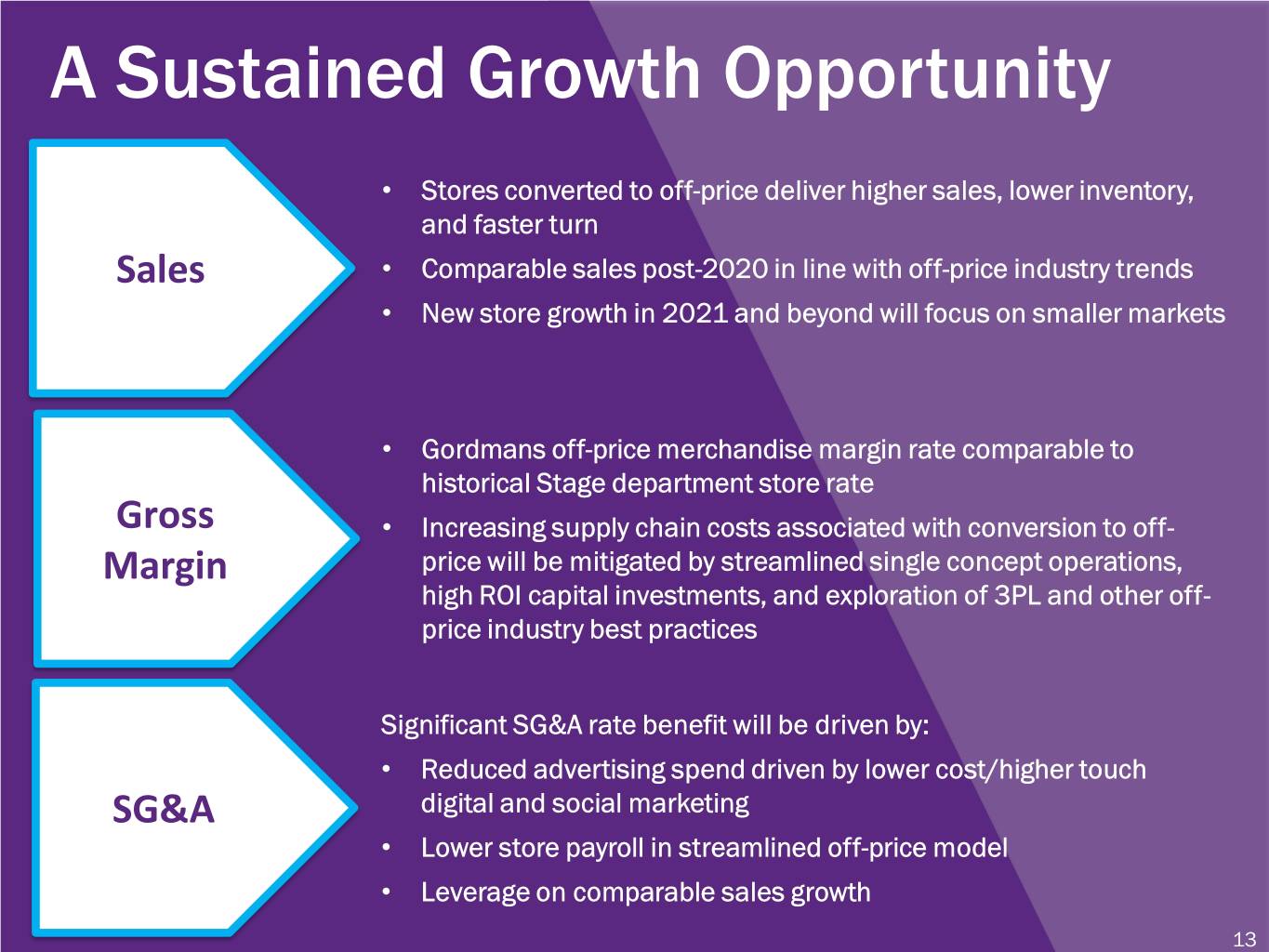 A Sustained Growth Opportunity • Stores converted to off-price deliver higher sales, lower inventory, and faster turn Sales • Comparable sales post-2020 in line with off-price industry trends • New store growth in 2021 and beyond will focus on smaller markets • Gordmans off-price merchandise margin rate comparable to historical Stage department store rate Gross • Increasing supply chain costs associated with conversion to off- Margin price will be mitigated by streamlined single concept operations, high ROI capital investments, and exploration of 3PL and other off- price industry best practices Significant SG&A rate benefit will be driven by: • Reduced advertising spend driven by lower cost/higher touch SG&A digital and social marketing • Lower store payroll in streamlined off-price model • Leverage on comparable sales growth 13