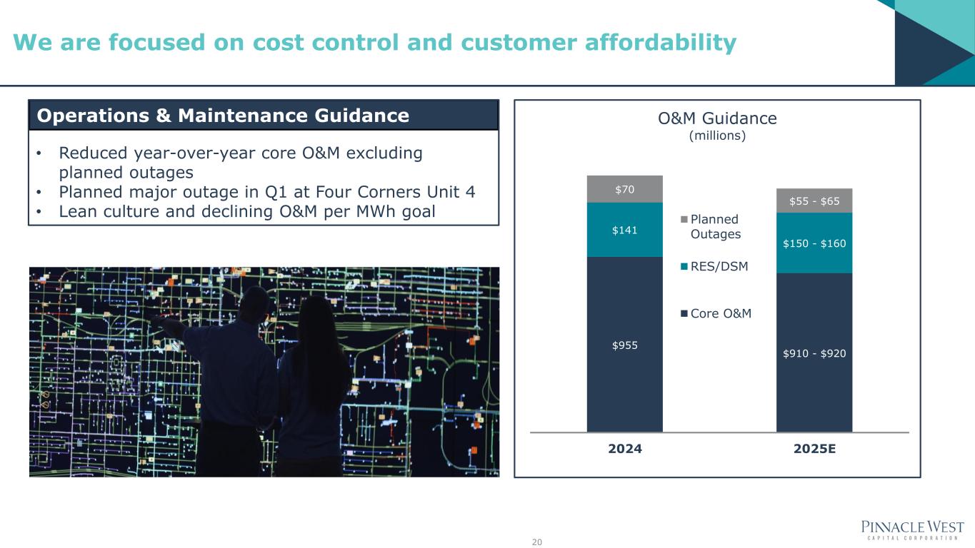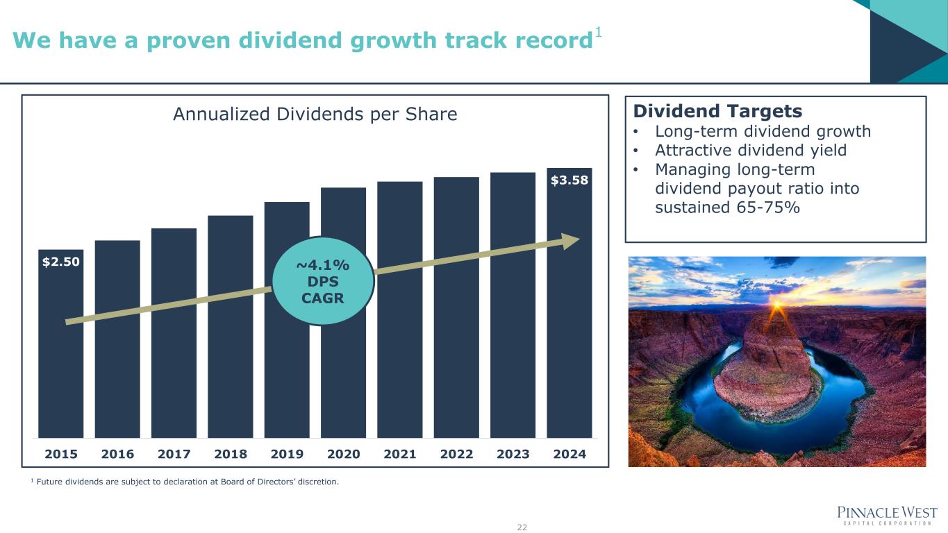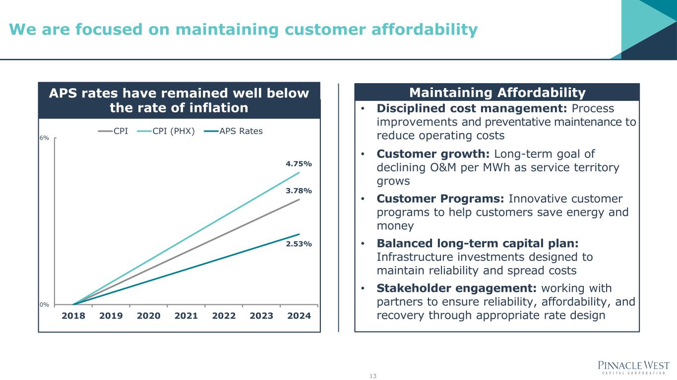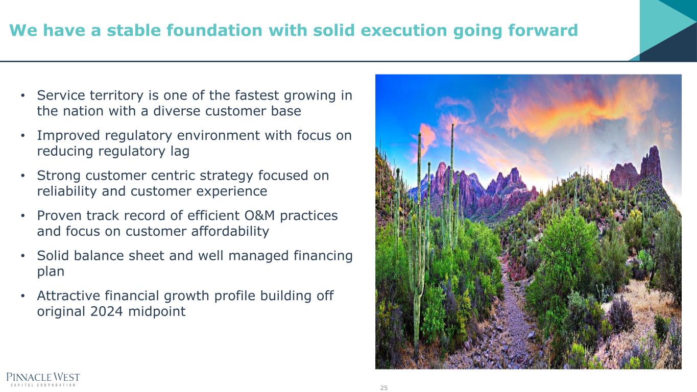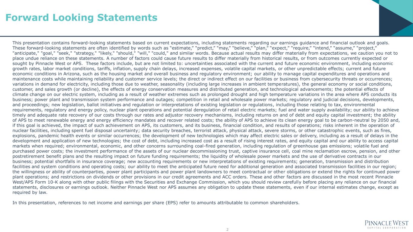 2 This presentation contains forward-looking statements based on current expectations, including statements regarding our earnings guidance and financial outlook and goals. These forward-looking statements are often identified by words such as “estimate,” “predict,” “may,” “believe,” “plan,” “expect,” “require,” “intend,” “assume,” “project,” "anticipate," "goal," "seek," "strategy," "likely," "should," "will," "could," and similar words. Because actual results may differ materially from expectations, we caution you not to place undue reliance on these statements. A number of factors could cause future results to differ materially from historical results, or from outcomes currently expected or sought by Pinnacle West or APS. These factors include, but are not limited to: uncertainties associated with the current and future economic environment, including economic growth rates, labor market conditions, tariffs, inflation, supply chain delays, increased expenses, volatile capital markets, or other unpredictable effects; current and future economic conditions in Arizona, such as the housing market and overall business and regulatory environment; our ability to manage capital expenditures and operations and maintenance costs while maintaining reliability and customer service levels; the direct or indirect effect on our facilities or business from cybersecurity threats or occurrences; variations in demand for electricity, including those due to weather, seasonality (including large increases in ambient temperatures), the general economy or social conditions, customer, and sales growth (or decline), the effects of energy conservation measures and distributed generation, and technological advancements; the potential effects of climate change on our electric system, including as a result of weather extremes such as prolonged drought and high temperature variations in the area where APS conducts its business; power plant and transmission system performance and outages; competition in retail and wholesale power markets; regulatory and judicial decisions, developments, and proceedings; new legislation, ballot initiatives and regulation or interpretations of existing legislation or regulations, including those relating to tax, environmental requirements, regulatory and energy policy, nuclear plant operations and potential deregulation of retail electric markets; fuel and water supply availability; our ability to achieve timely and adequate rate recovery of our costs through our rates and adjustor recovery mechanisms, including returns on and of debt and equity capital investment; the ability of APS to meet renewable energy and energy efficiency mandates and recover related costs; the ability of APS to achieve its clean energy goal to be carbon-neutral by 2050 and, if this goal is achieved, the impact of such achievement on APS, its customers, and its business, financial condition, and results of operations; risks inherent in the operation of nuclear facilities, including spent fuel disposal uncertainty; data security breaches, terrorist attack, physical attack, severe storms, or other catastrophic events, such as fires, explosions, pandemic health events or similar occurrences; the development of new technologies which may affect electric sales or delivery, including as a result of delays in the development and application of new technologies; the cost of debt, including increased cost as a result of rising interest rates, and equity capital and our ability to access capital markets when required; environmental, economic, and other concerns surrounding coal-fired generation, including regulation of greenhouse gas emissions; volatile fuel and purchased power costs; the investment performance of the assets of our nuclear decommissioning trust, captive insurance cell, coal mine reclamation escrow, pension, and other postretirement benefit plans and the resulting impact on future funding requirements; the liquidity of wholesale power markets and the use of derivative contracts in our business; potential shortfalls in insurance coverage; new accounting requirements or new interpretations of existing requirements; generation, transmission and distribution facilities and system conditions and operating costs; our ability to meet the anticipated future need for additional generation and associated transmission facilities in our region; the willingness or ability of counterparties, power plant participants and power plant landowners to meet contractual or other obligations or extend the rights for continued power plant operations; and restrictions on dividends or other provisions in our credit agreements and ACC orders. These and other factors are discussed in the most recent Pinnacle West/APS Form 10-K along with other public filings with the Securities and Exchange Commission, which you should review carefully before placing any reliance on our financial statements, disclosures or earnings outlook. Neither Pinnacle West nor APS assumes any obligation to update these statements, even if our internal estimates change, except as required by law. In this presentation, references to net income and earnings per share (EPS) refer to amounts attributable to common shareholders. Forward Looking Statements