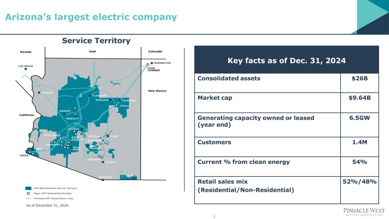 Key facts as of Dec. 31, 2024 Consolidated assets $26B Market cap $9.64B Generating capacity owned or leased (year end) 6.5GW Customers 1.4M Current % from clean energy 54% Retail sales mix (Residential/Non-Residential) 52%/48% Service Territory 5 Arizona’s largest electric company As of December 31, 2024.