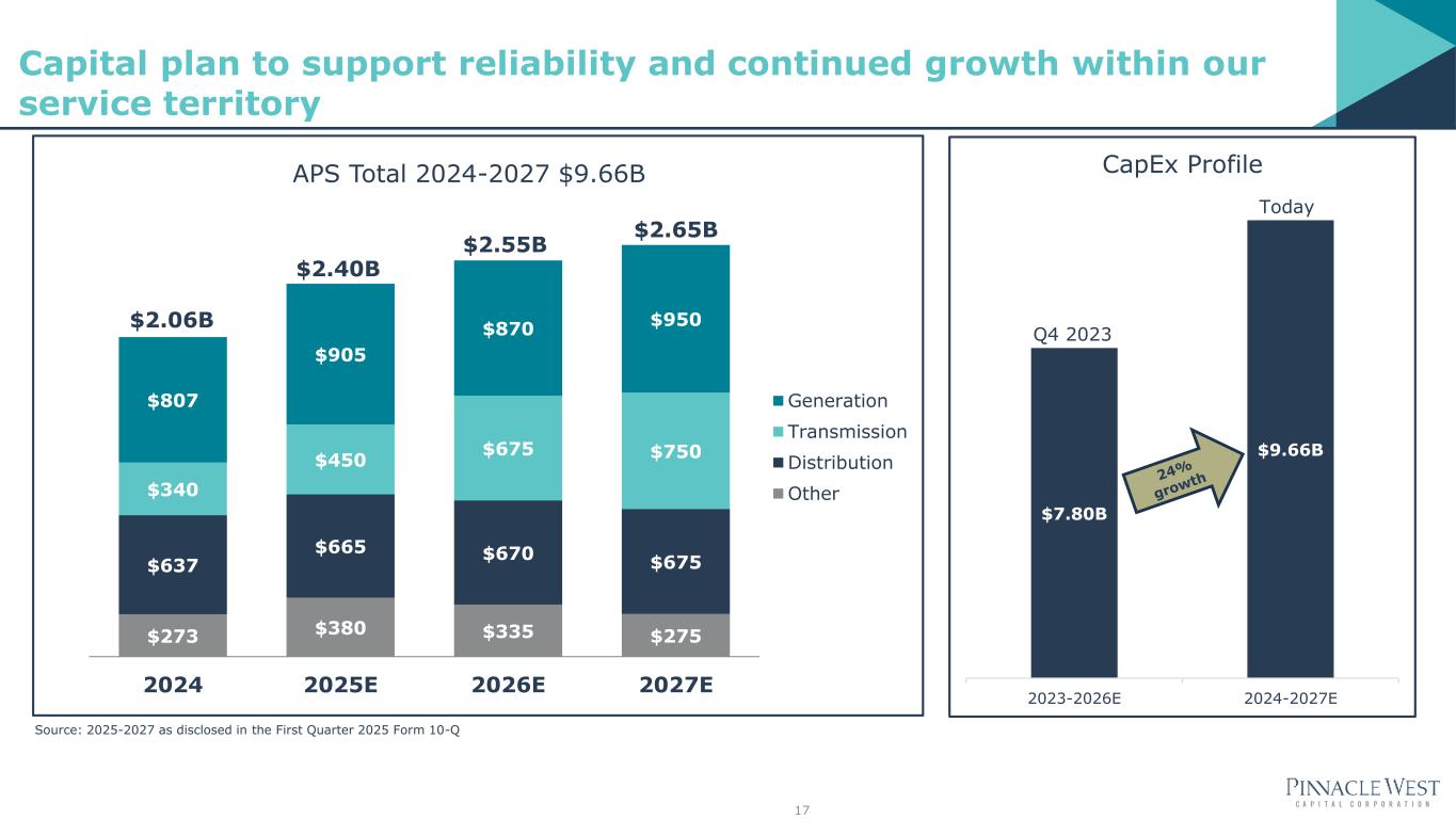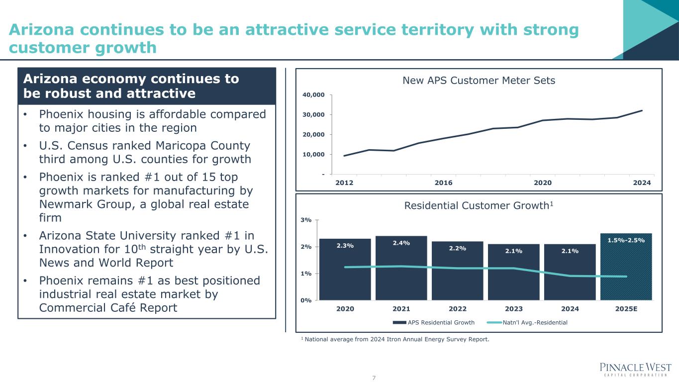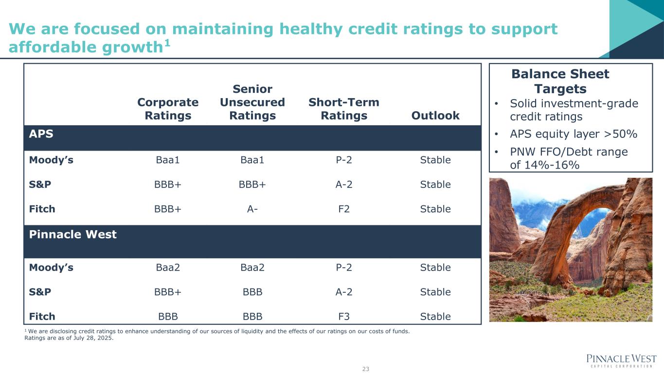 Balance Sheet Targets • Solid investment-grade credit ratings • APS equity layer >50% • PNW FFO/Debt range of 14%-16% Corporate Ratings Senior Unsecured Ratings Short-Term Ratings Outlook APS Moody’s Baa1 Baa1 P-2 Stable S&P BBB+ BBB+ A-2 Stable Fitch BBB+ A- F2 Stable Pinnacle West Moody’s Baa2 Baa2 P-2 Stable S&P BBB+ BBB A-2 Stable Fitch BBB BBB F3 Stable 23 1 We are disclosing credit ratings to enhance understanding of our sources of liquidity and the effects of our ratings on our costs of funds. Ratings are as of July 28, 2025. We are focused on maintaining healthy credit ratings to support affordable growth1