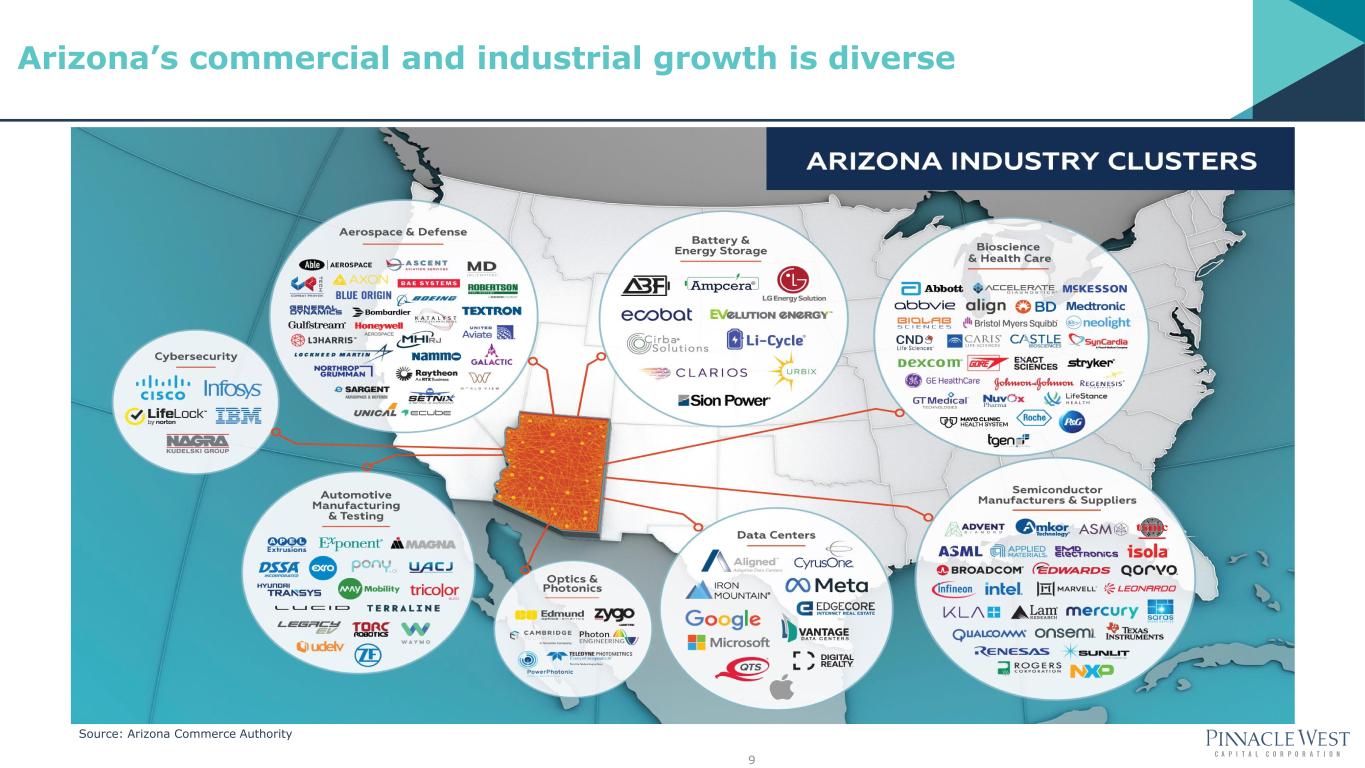 • Infrastructure ─ close proximity to major markets in the West with accessibility by rail or truck • Weather predictability ─ low propensity for natural disasters and greatest solar irradiance in America • Workforce availability ─ three major universities graduating a skilled labor force • Affordability ─ business friendly policies and regulation • Accounts for 3%-5% of the 4%-6% long-term weather normalized sales growth1 guidance • Amplifier effect for jobs and surrounding communities leading to residential growth • Proposed rate design modifications including direct assignment of generation costs to ensure growth pays for growth Large C&I customers as a growth driver Arizona is an attractive location for business growth Best-in-class service territory supports high tech growth and economic development 8 1 Forecasted guidance range through 2027.