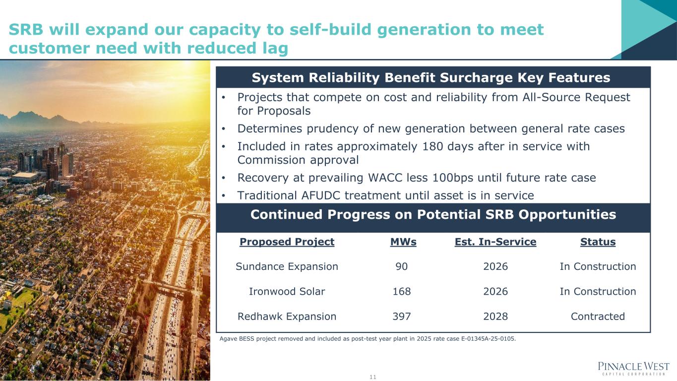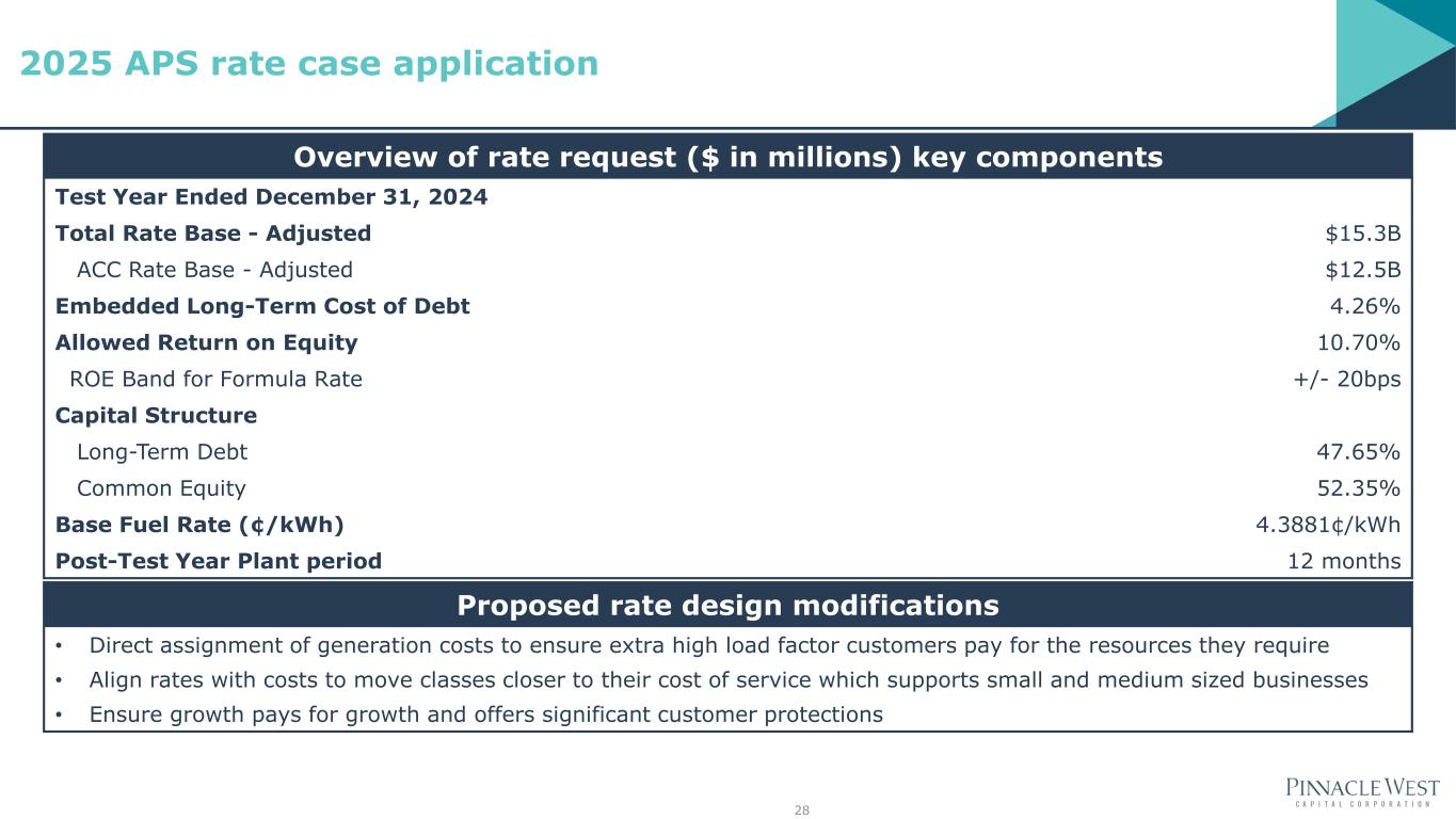 27 2025 APS rate case application Overview of rate request ($ in millions) key components Rate Base Growth $208 12 months Post-test Year Plant $82 Fair Value Increment $101 WACC (7.63%) $129 Other (Base fuel, depreciation study, etc.) $143 Total Revenue Requirement $662 Adjustor Transfers $(82) Net Revenue Increase $580 Customer Net Revenue Impact on Day 1 13.99% Additional details • APS has requested rates become effective in the second half of 2026 • Docket number: E-01345A-25-0105 • Additional details, including filing, can be found at http://www.pinnaclewest.com/investors Numbers may not foot due to rounding.