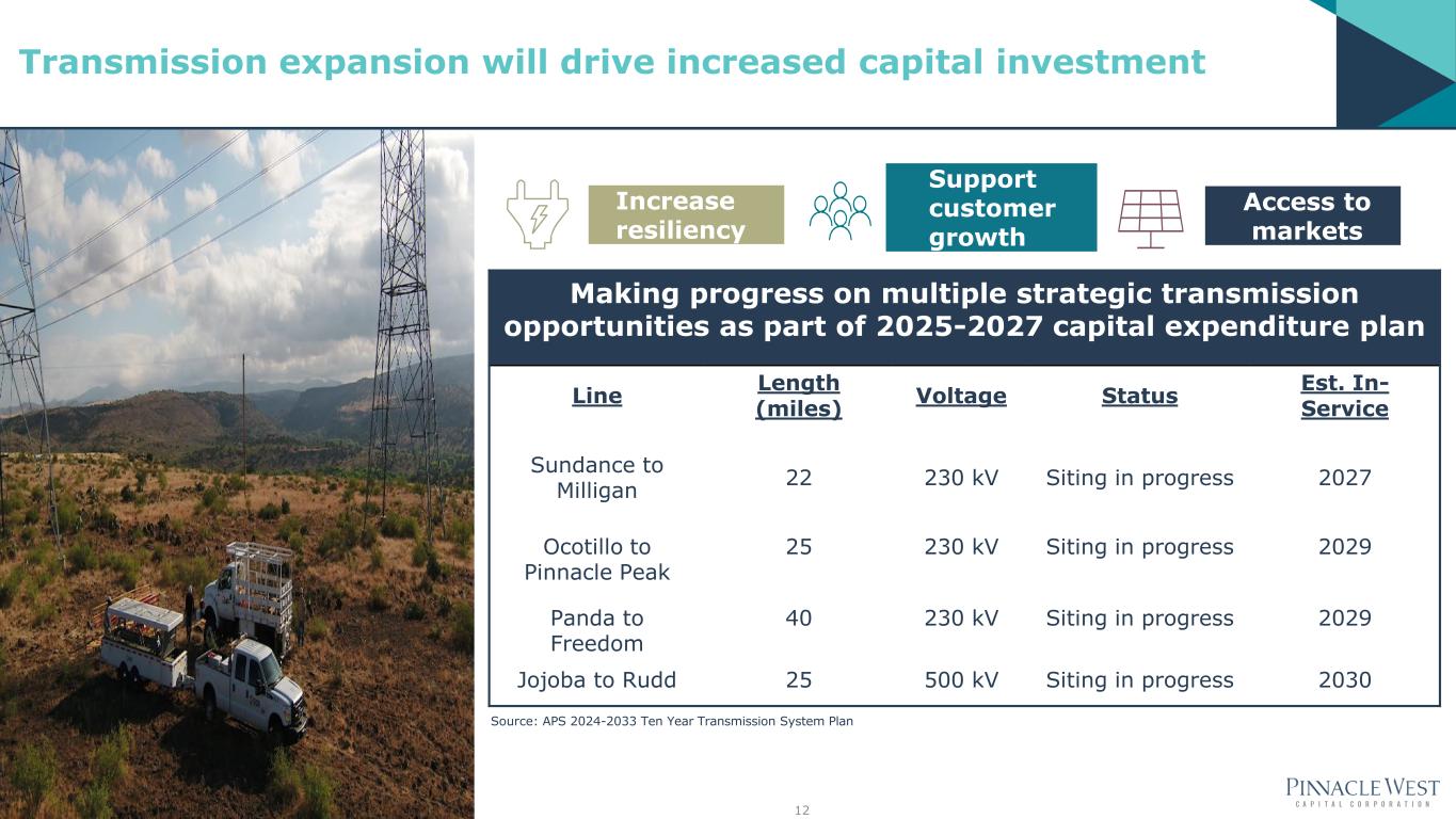Source: APS 2024-2033 Ten Year Transmission System Plan Support customer growth Access to markets Increase resiliency 12 Making progress on multiple strategic transmission opportunities as part of 2025-2027 capital expenditure plan Line Length (miles) Voltage Status Est. In- Service Sundance to Milligan 22 230 kV Siting in progress 2027 Ocotillo to Pinnacle Peak 25 230 kV Siting in progress 2029 Panda to Freedom 40 230 kV Siting in progress 2029 Jojoba to Rudd 25 500 kV Siting in progress 2030 Transmission expansion will drive increased capital investment