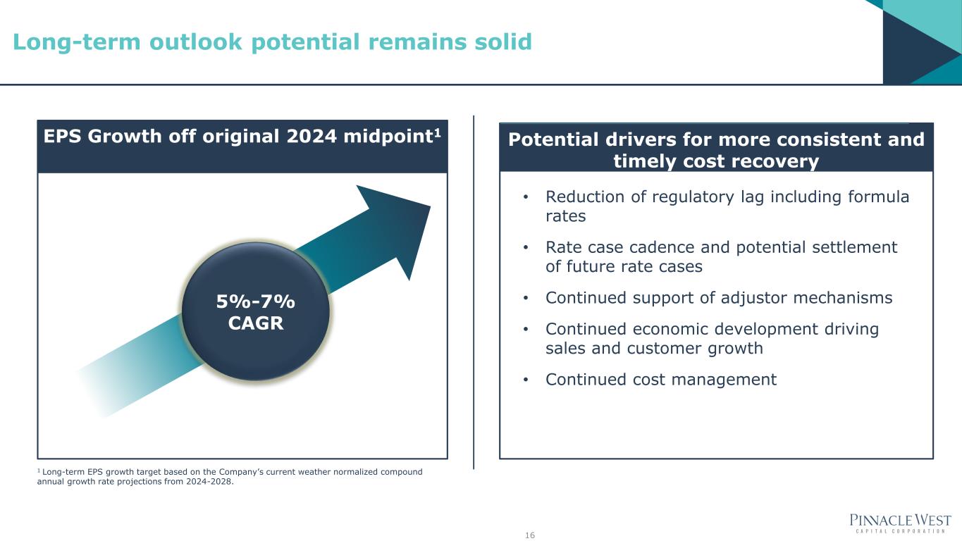 1. Long-term EPS growth of 5%-7% off original 2024 midpoint, supporting competitive total shareholder return 2. Optimized capital plan to reliably serve growing service territory, driving strong rate base growth and supported by SRB 3. Managing a healthy capital structure with accretive equity to support investment 4. Declining O&M per MWh with focus on customer affordability 5. Competitive shareholder dividend 6. Solid balance sheet and credit ratings 15 Our investor goals going forward
