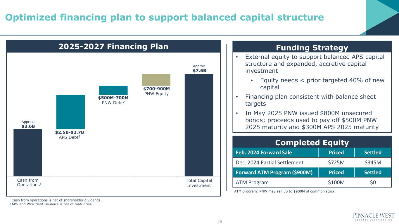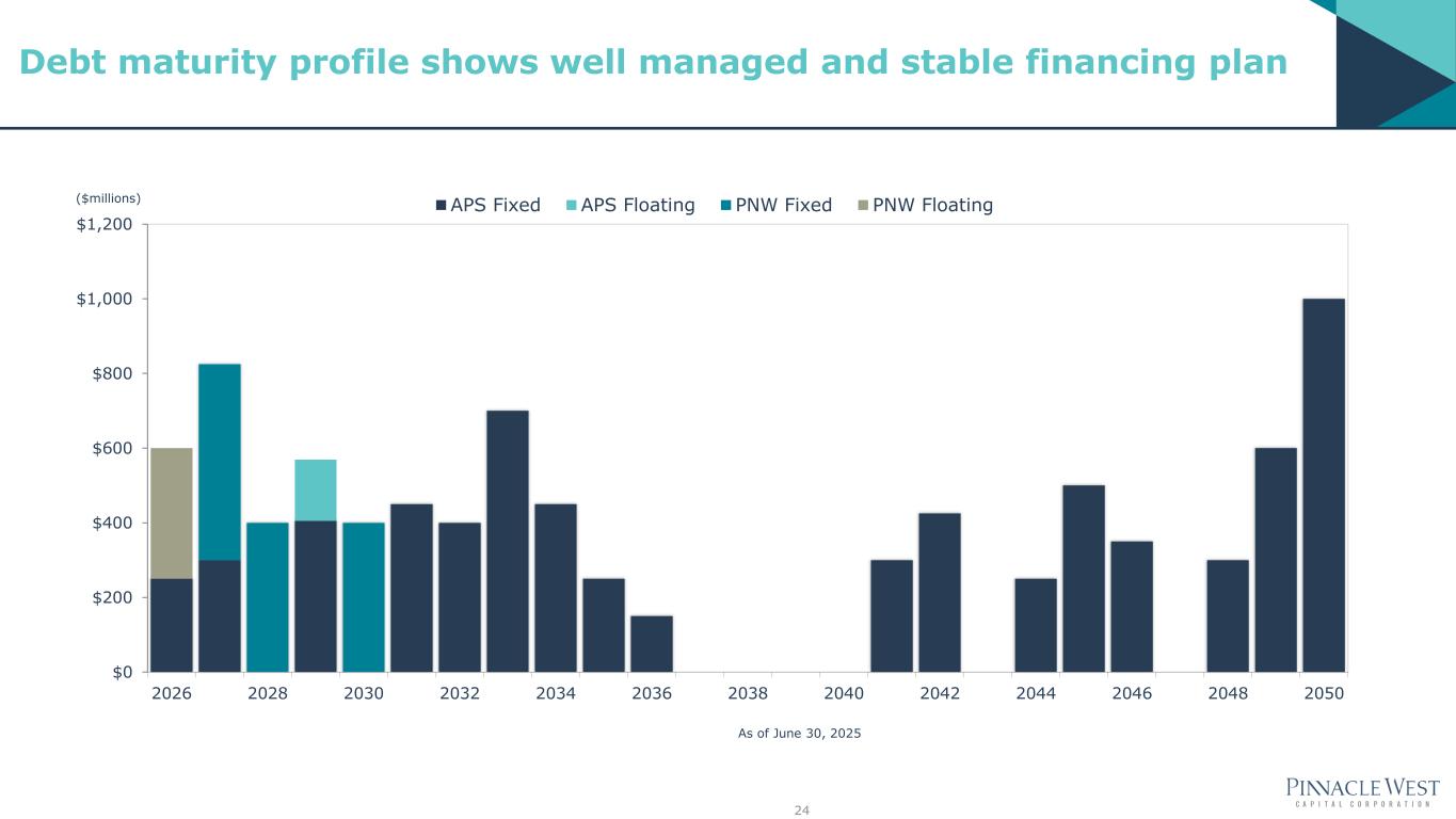 $0 $200 $400 $600 $800 $1,000 $1,200 2026 2028 2030 2032 2034 2036 2038 2040 2042 2044 2046 2048 2050 APS Fixed APS Floating PNW Fixed PNW Floating($millions) As of June 30, 2025 24 Debt maturity profile shows well managed and stable financing plan