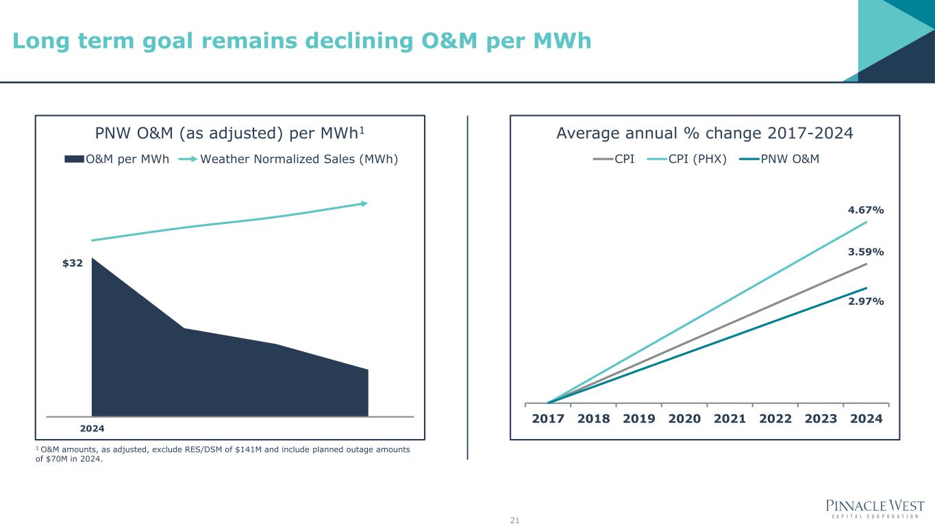 20 Operations & Maintenance Guidance • Reduced year-over-year core O&M excluding planned outages • Planned major outage in Q1 at Four Corners Unit 4 • Lean culture and declining O&M per MWh goal We are focused on cost control and customer affordability $955 $910 - $920 $141 $150 - $160 $70 $55 - $65 2024 2025E O&M Guidance (millions) Planned Outages RES/DSM Core O&M