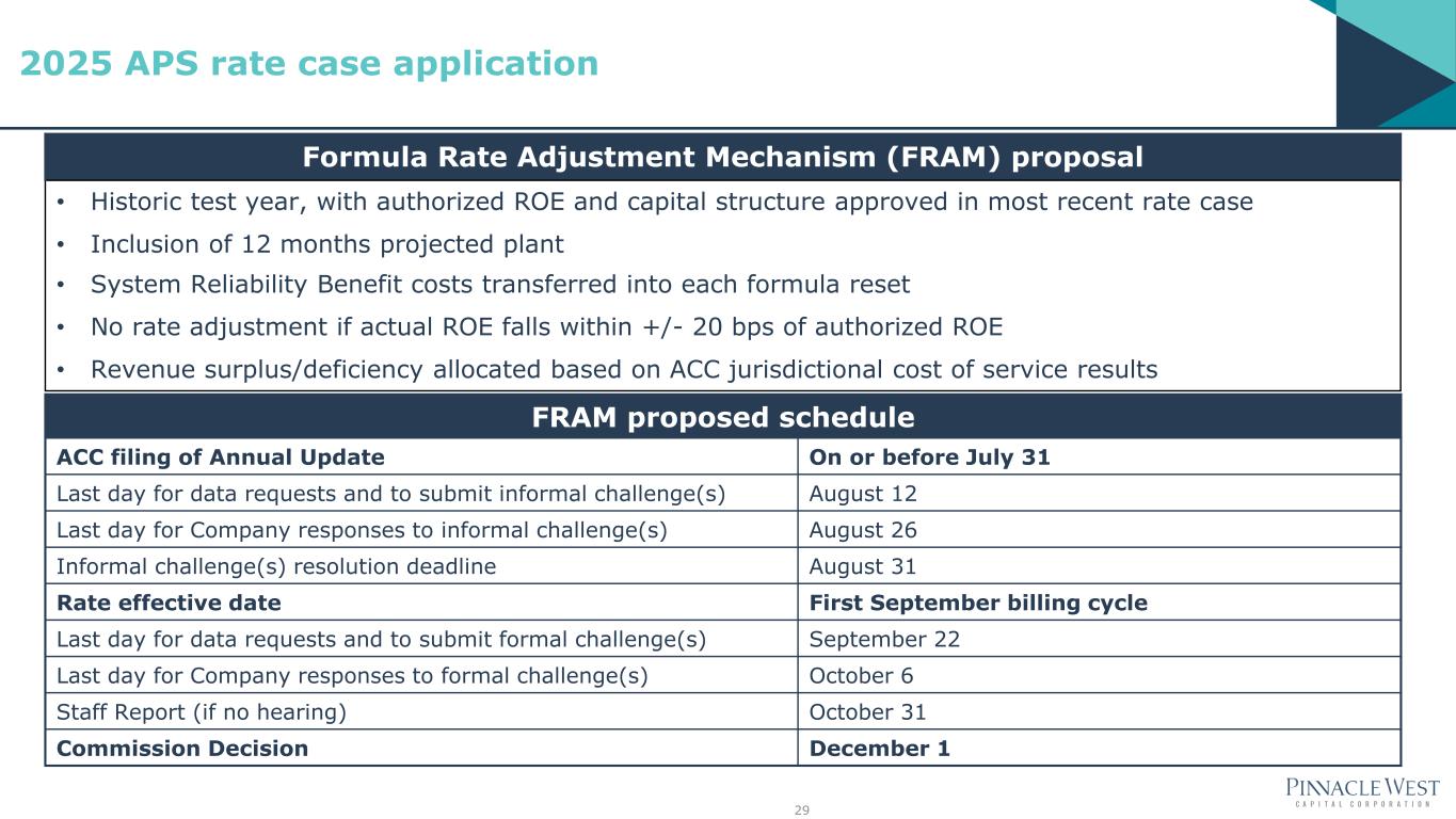 29 2025 APS rate case application Formula Rate Adjustment Mechanism (FRAM) proposal • Historic test year, with authorized ROE and capital structure approved in most recent rate case • Inclusion of 12 months projected plant • System Reliability Benefit costs transferred into each formula reset • No rate adjustment if actual ROE falls within +/- 20 bps of authorized ROE • Revenue surplus/deficiency allocated based on ACC jurisdictional cost of service results FRAM proposed schedule ACC filing of Annual Update On or before July 31 Last day for data requests and to submit informal challenge(s) August 12 Last day for Company responses to informal challenge(s) August 26 Informal challenge(s) resolution deadline August 31 Rate effective date First September billing cycle Last day for data requests and to submit formal challenge(s) September 22 Last day for Company responses to formal challenge(s) October 6 Staff Report (if no hearing) October 31 Commission Decision December 1