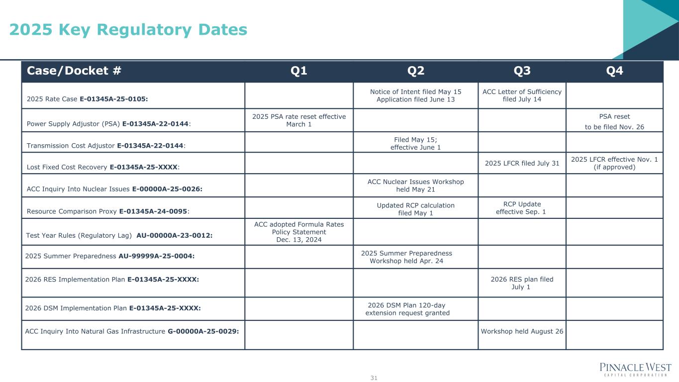 Case/Docket # Q1 Q2 Q3 Q4 2025 Rate Case E-01345A-25-0105: Notice of Intent filed May 15 Application filed June 13 ACC Letter of Sufficiency filed July 14 Power Supply Adjustor (PSA) E-01345A-22-0144: 2025 PSA rate reset effective March 1 PSA reset to be filed Nov. 26 Transmission Cost Adjustor E-01345A-22-0144: Filed May 15; effective June 1 Lost Fixed Cost Recovery E-01345A-25-XXXX: 2025 LFCR filed July 31 2025 LFCR effective Nov. 1 (if approved) ACC Inquiry Into Nuclear Issues E-00000A-25-0026: ACC Nuclear Issues Workshop held May 21 Resource Comparison Proxy E-01345A-24-0095: Updated RCP calculation filed May 1 RCP Update effective Sep. 1 Test Year Rules (Regulatory Lag) AU-00000A-23-0012: ACC adopted Formula Rates Policy Statement Dec. 13, 2024 2025 Summer Preparedness AU-99999A-25-0004: 2025 Summer Preparedness Workshop held Apr. 24 2026 RES Implementation Plan E-01345A-25-XXXX: 2026 RES plan filed July 1 2026 DSM Implementation Plan E-01345A-25-XXXX: 2026 DSM Plan 120-day extension request granted ACC Inquiry Into Natural Gas Infrastructure G-00000A-25-0029: Workshop held August 26 31 2025 Key Regulatory Dates