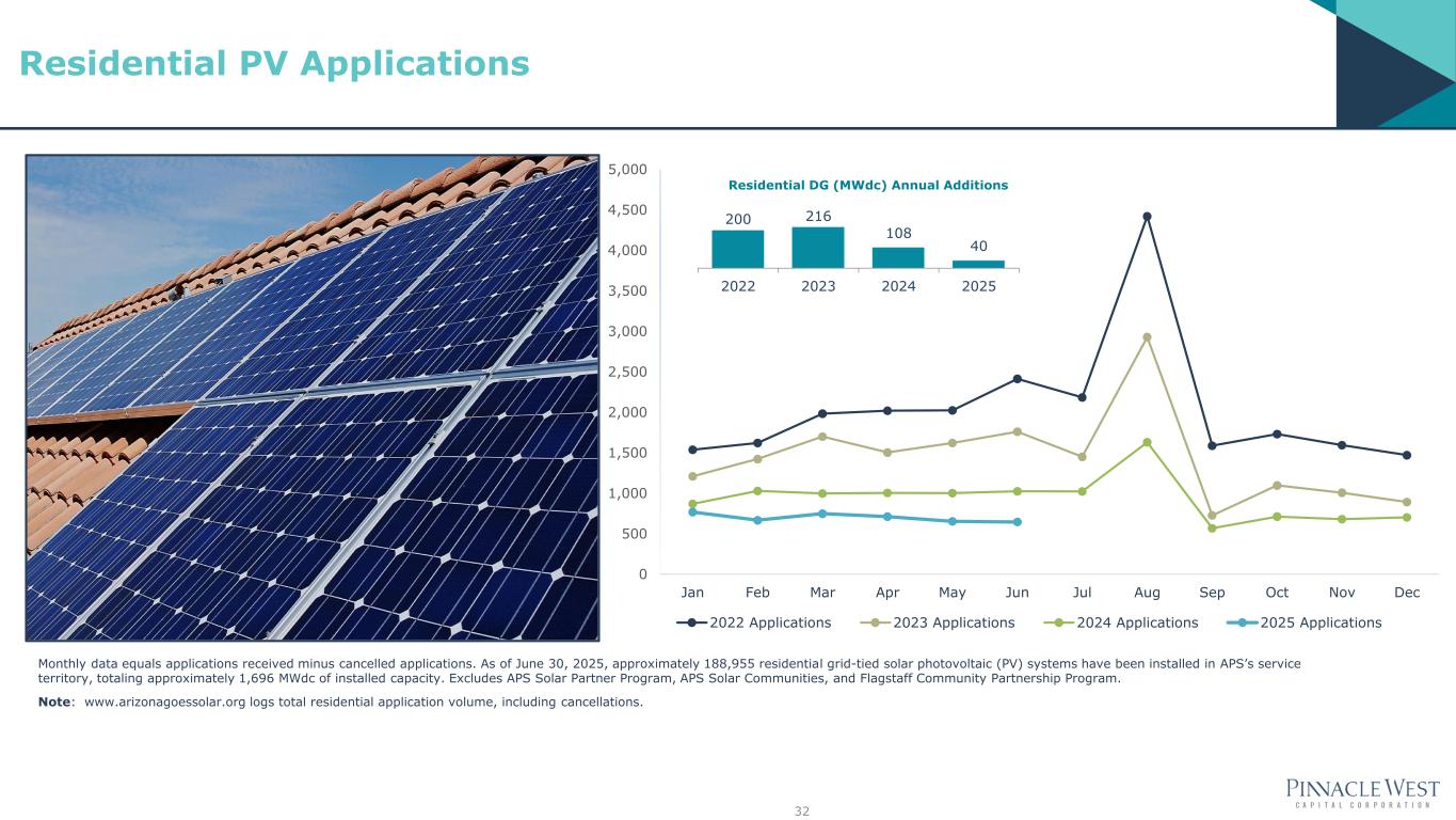 0 500 1,000 1,500 2,000 2,500 3,000 3,500 4,000 4,500 5,000 Jan Feb Mar Apr May Jun Jul Aug Sep Oct Nov Dec 2022 Applications 2023 Applications 2024 Applications 2025 Applications 200 216 108 40 2022 2023 2024 2025 Monthly data equals applications received minus cancelled applications. As of June 30, 2025, approximately 188,955 residential grid-tied solar photovoltaic (PV) systems have been installed in APS’s service territory, totaling approximately 1,696 MWdc of installed capacity. Excludes APS Solar Partner Program, APS Solar Communities, and Flagstaff Community Partnership Program. Note: www.arizonagoessolar.org logs total residential application volume, including cancellations. Residential DG (MWdc) Annual Additions 32 Residential PV Applications