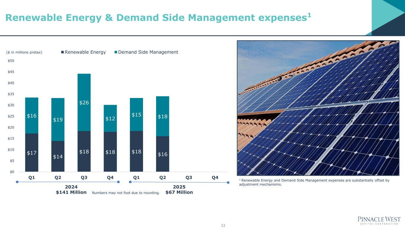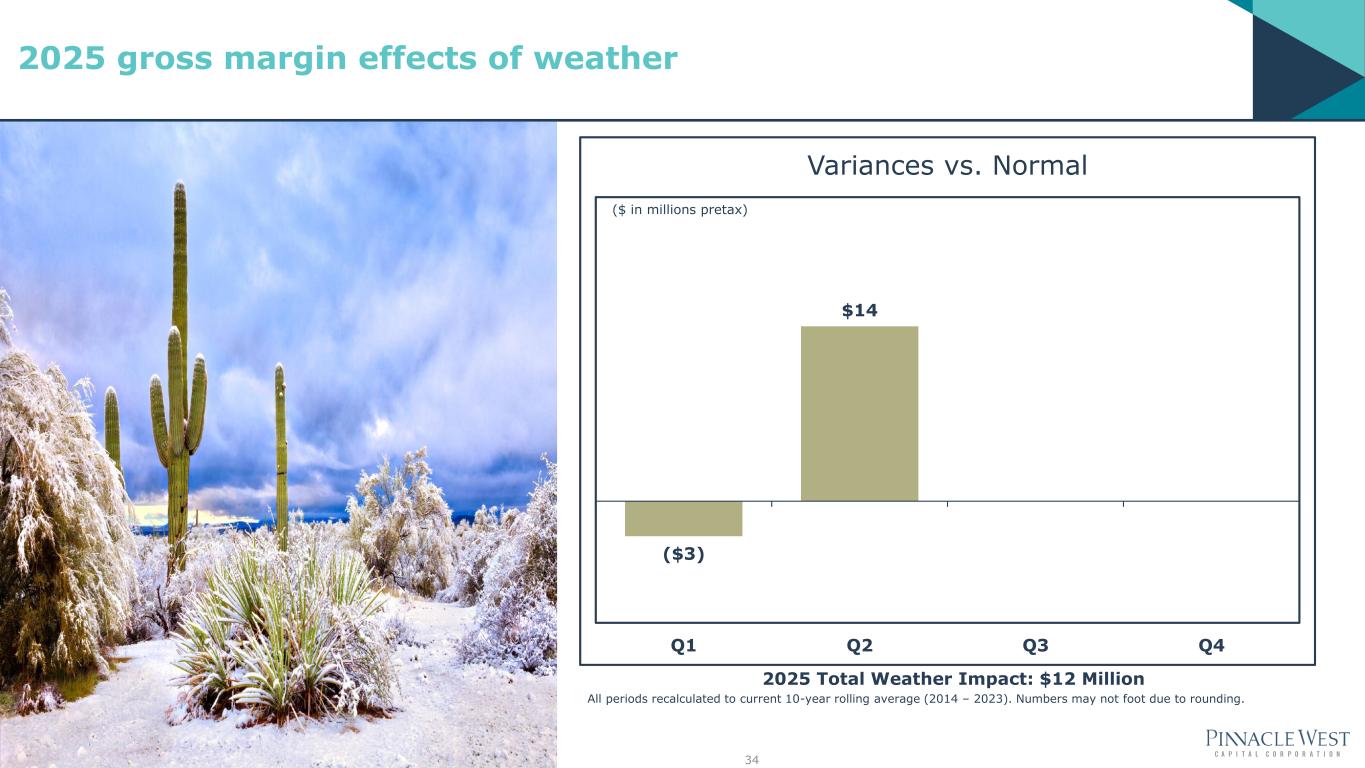 $17 $14 $18 $18 $18 $16 $16 $19 $26 $12 $15 $18 $0 $5 $10 $15 $20 $25 $30 $35 $40 $45 $50 Q1 Q2 Q3 Q4 Q1 Q2 Q3 Q4 Renewable Energy Demand Side Management 2024 $141 Million 2025 $67 Million 1 Renewable Energy and Demand Side Management expenses are substantially offset by adjustment mechanisms. Numbers may not foot due to rounding. ($ in millions pretax) 33 Renewable Energy & Demand Side Management expenses1