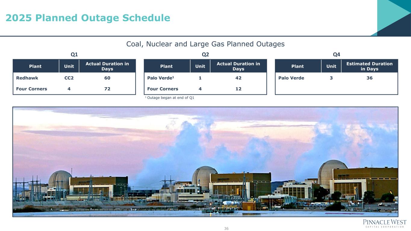 Q1 Plant Unit Actual Duration in Days Redhawk CC2 60 Four Corners 4 72 Coal, Nuclear and Large Gas Planned Outages 36 2025 Planned Outage Schedule Q2 Plant Unit Actual Duration in Days Palo Verde1 1 42 Four Corners 4 12 Q4 Plant Unit Estimated Duration in Days Palo Verde 3 36 1 Outage began at end of Q1