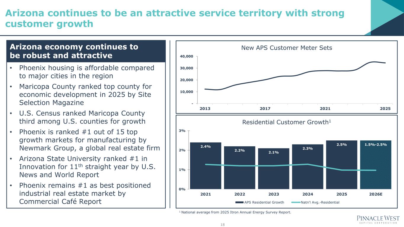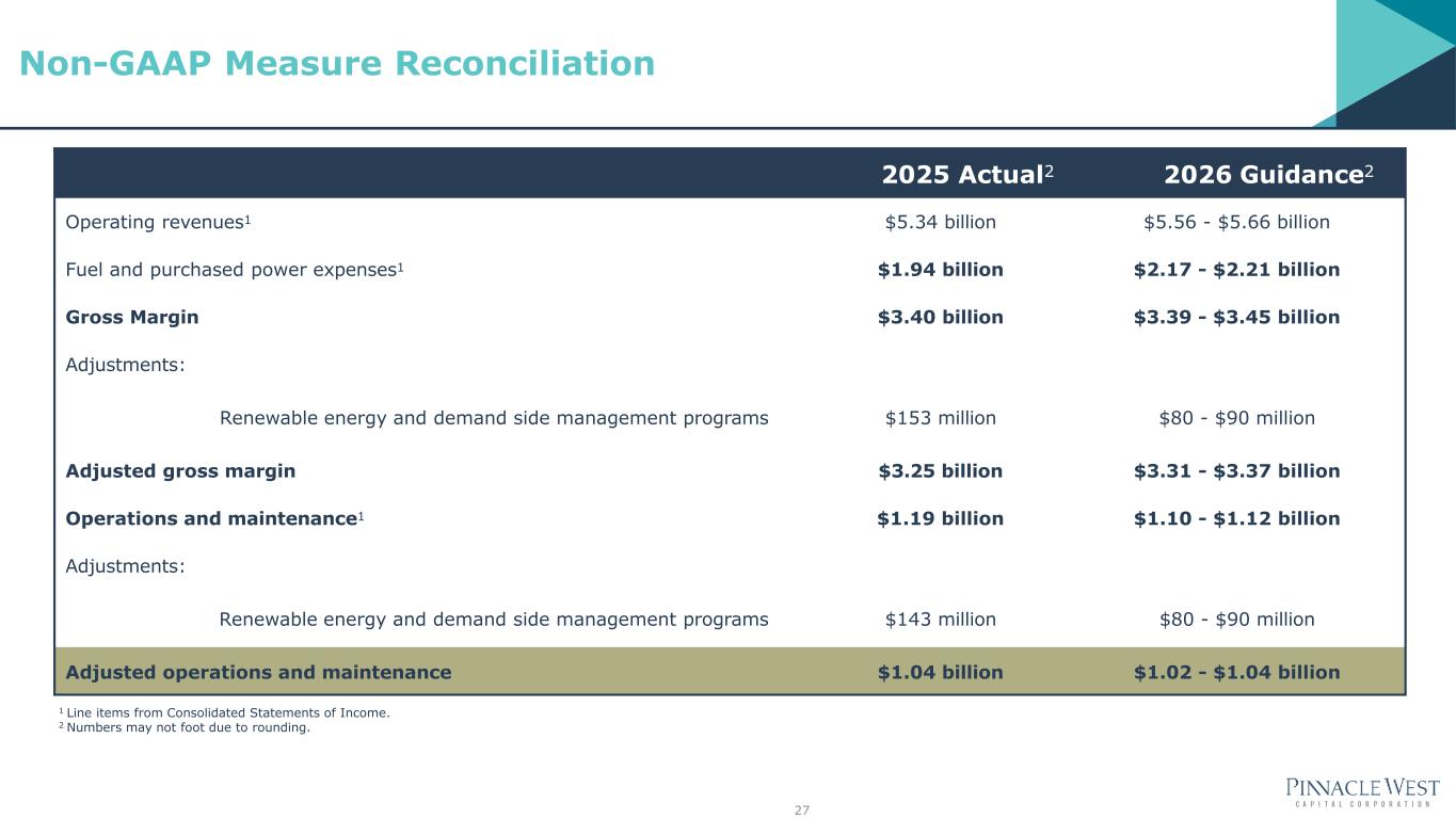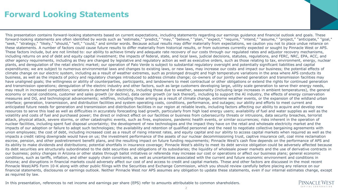 2 This presentation contains forward-looking statements based on current expectations, including statements regarding our earnings guidance and financial outlook and goals. These forward-looking statements are often identified by words such as “estimate,” “predict,” “may,” “believe,” “plan,” “expect,” “require,” “intend,” “assume,” “project,” "anticipate," "goal," "seek," "strategy," "likely," "should," "will," "could," and similar words. Because actual results may differ materially from expectations, we caution you not to place undue reliance on these statements. A number of factors could cause future results to differ materially from historical results, or from outcomes currently expected or sought by Pinnacle West or APS. These factors include, but are not limited to: our ability to achieve timely and adequate rate recovery of our costs through our regulated rates and adjustor recovery mechanisms, including returns on and of debt and equity capital investment; the impacts of federal, state, and local laws, judicial decisions, statutes, regulations, and FERC, NRC, EPA, ACC, and other agency requirements, including as they are changed by legislative and regulatory action as well as executive orders, such as those relating to tax, environment, energy, nuclear plants, and deregulation of the retail electric market; our operation of Palo Verde is subject to substantial regulatory oversight and potentially significant liabilities and capital expenditures; we are subject to numerous environmental laws and changes to existing laws, or new laws, may increase our costs and impact our business; the potential effects of climate change on our electric system, including as a result of weather extremes, such as prolonged drought and high temperature variations in the area where APS conducts its business, as well as the impacts of policy and regulatory changes introduced to address climate change; co-owners of our jointly owned generation and transmission facilities may have unaligned goals; the willingness or ability of counterparties, participants, and landowners to meet contractual or other obligations or extend the rights for continued generation and transmission operations; deregulation of the electric industry and other factors, such as large customers developing large, utility scale generation to serve their energy needs, may result in increased competition; variations in demand for electricity, including those due to weather, seasonality (including large increases in ambient temperatures), the general economy or social conditions, customer and sales growth (or decline), data center growth (or lack thereof), including to support the AI industry, the effects of energy conservation measures and DG, and technological advancements; wildfires, including those arising as a result of climate change, extreme weather events, or the expansion of the wildland urban interface; generation, transmission, and distribution facilities and system operating costs, conditions, performance, and outages; our ability and efforts to meet current and anticipated future needs for generation and transmission and distribution facilities in our region at reliable levels, including factors affecting our ability to acquire and develop new resources to serve this load as well as difficulties in accurately forecasting load growth, particularly from high load energy users; availability of fuel and water supplies as well as the volatility and costs of fuel and purchased power; the direct or indirect effect on our facilities or business from cybersecurity threats or intrusions, data security breaches, terrorist attack, physical attack, severe storms, or other catastrophic events, such as fires, explosions, pandemic health events, or similar occurrences; risks inherent in the operation of nuclear facilities, including spent fuel disposal uncertainty; the development of new technologies and the impact they have on the retail and wholesale electricity market and the impacts of our adoption or failure to adopt such technologies; the availability and retention of qualified personnel and the need to negotiate collective bargaining agreements with union employees; the cost of debt, including increased cost as a result of rising interest rates, and equity capital and our ability to access capital markets when required as well as the impacts a credit rating downgrade would have on us; the investment performance of the assets of our nuclear decommissioning trust, captive insurance cell, coal mine reclamation escrow, pension, and other postretirement benefit plans, and the resulting impact on future funding requirements; Pinnacle West’s cash flow depends on the performance of APS and its ability to make dividends and distributions; potential shortfalls in insurance coverage; Pinnacle West’s ability to meet its debt service obligation could be adversely affected because its debt securities are structurally subordinated to the debt securities and obligations of its subsidiaries; the liquidity of wholesale power markets and the use of derivative contracts in our business; policy changes in Arizona or other states through ballot initiatives or referenda may increase our cost or operations or affect our business plans; general economic conditions, such as tariffs, inflation, and other supply chain constraints, as well as uncertainties associated with the current and future economic environment and conditions in Arizona; and disruptions in financial markets could adversely affect our cost of and access to credit and capital markets. These and other factors are discussed in the most recent Pinnacle West/APS Form 10-K along with other public filings with the Securities and Exchange Commission, which you should review carefully before placing any reliance on our financial statements, disclosures or earnings outlook. Neither Pinnacle West nor APS assumes any obligation to update these statements, even if o