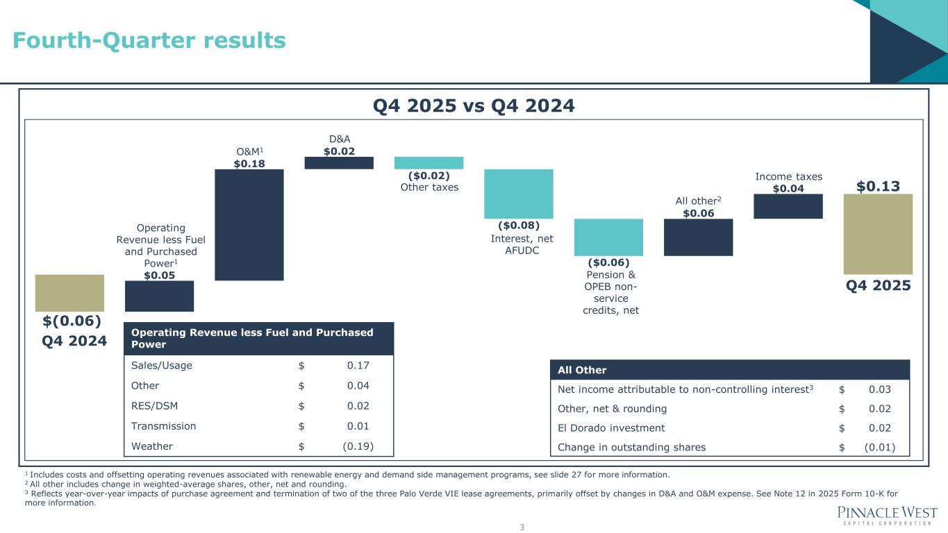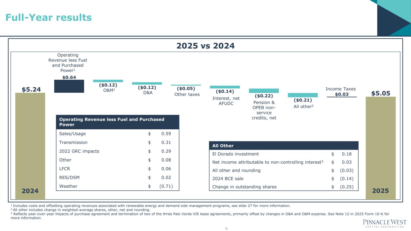 $0.05 $0.18 $0.02 ($0.02) ($0.08) ($0.06) $0.06 $0.04 $(0.06) $0.13 Q4 2025 vs Q4 2024 Operating Revenue less Fuel and Purchased Power Sales/Usage $ 0.17 Other $ 0.04 RES/DSM $ 0.02 Transmission $ 0.01 Weather $ (0.19) Q4 2024 Q4 2025 1 Includes costs and offsetting operating revenues associated with renewable energy and demand side management programs, see slide 27 for more information. 2 All other includes change in weighted-average shares, other, net and rounding. 3 Reflects year-over-year impacts of purchase agreement and termination of two of the three Palo Verde VIE lease agreements, primarily offset by changes in D&A and O&M expense. See Note 12 in 2025 Form 10-K for more information. Operating Revenue less Fuel and Purchased Power1 O&M1 D&A Pension & OPEB non- service credits, net Interest, net AFUDC All other2 3 Fourth-Quarter results All Other Net income attributable to non-controlling interest3 $ 0.03 Other, net & rounding $ 0.02 El Dorado investment $ 0.02 Change in outstanding shares $ (0.01) Other taxes Income taxes
